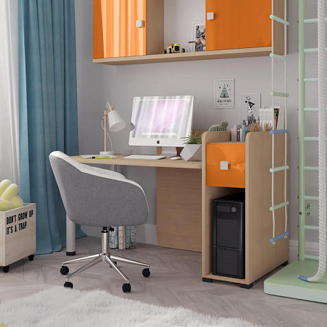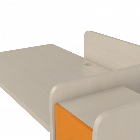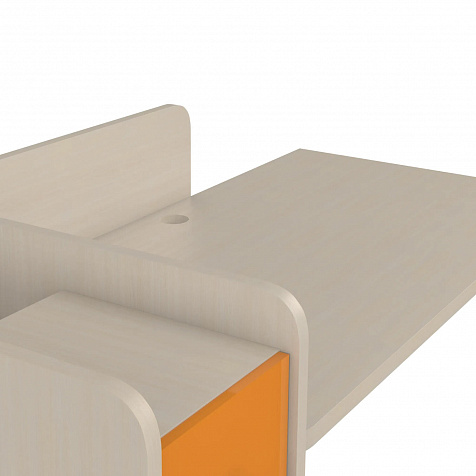 Просторная столешница с отверстием для проводов. Широкая столешница позволяет установить компьютер и разложить необходимые для учёбы и творчества материалы. В крышке стола предусмотрено отверстие для удобного вывода проводов.