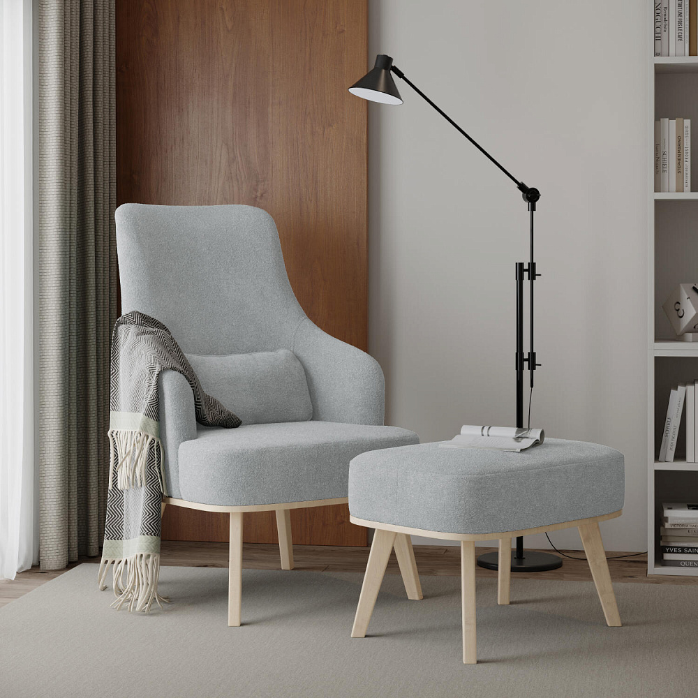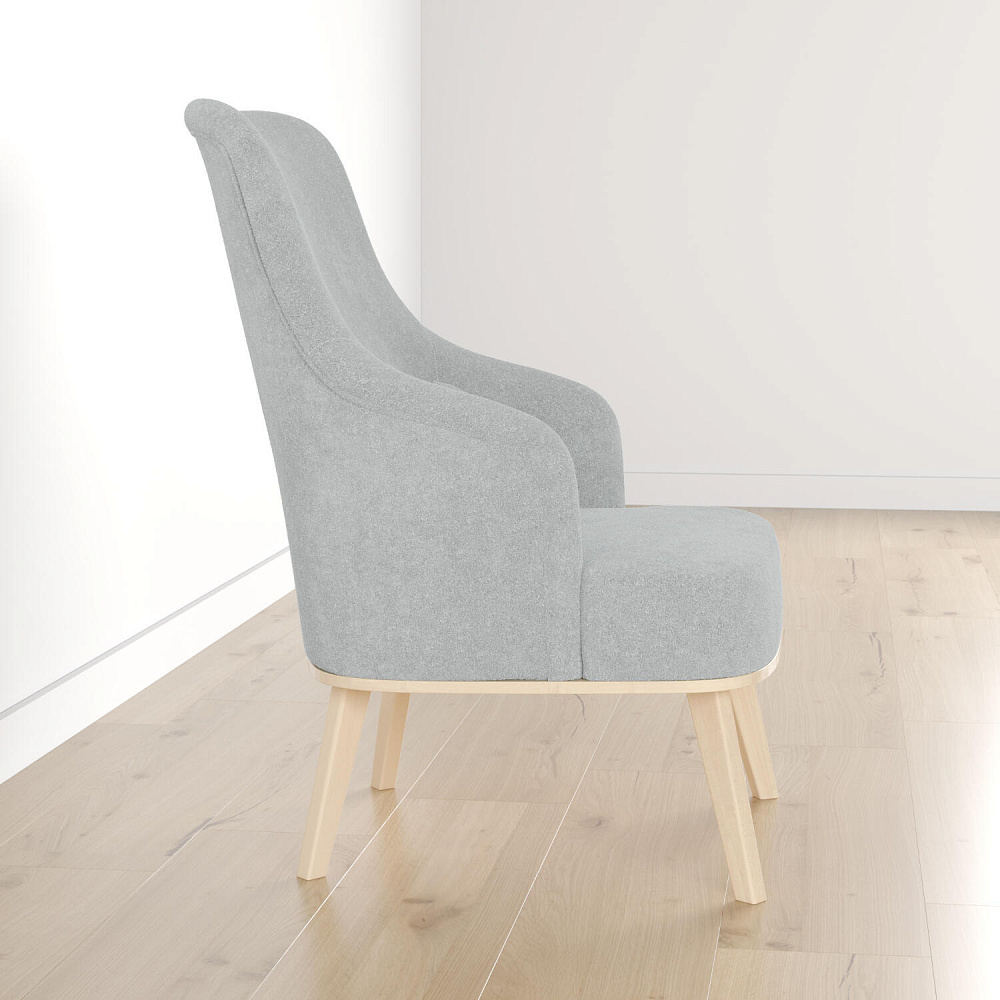 Кресло «Ноа» — минималистичная модель идеально подойдет для создания уютной зоны отдыха. Кресло в скандинавском стиле выделяется высокой спинкой, плавно перетекающей в подлокотники. Лаконичный образ завершает деревянное основание с тонкими опорами. Небольшая декоративная подушка поможет скорректировать глубину посадки для более комфортного отдыха.
