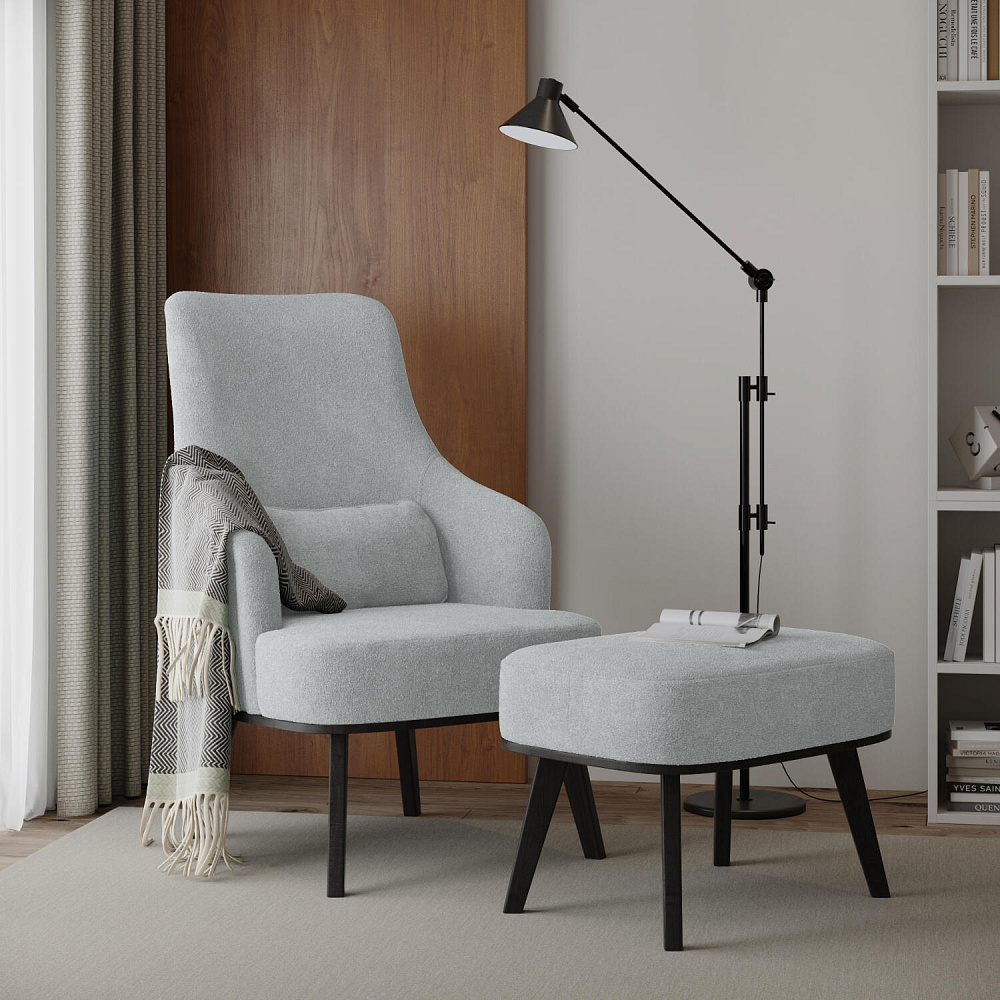 Кресло «Ноа» — минималистичная модель идеально подойдет для создания уютной зоны отдыха. Кресло в скандинавском стиле выделяется высокой спинкой, плавно перетекающей в подлокотники. Лаконичный образ завершает деревянное основание с тонкими опорами. Небольшая декоративная подушка поможет скорректировать глубину посадки для более комфортного отдыха.