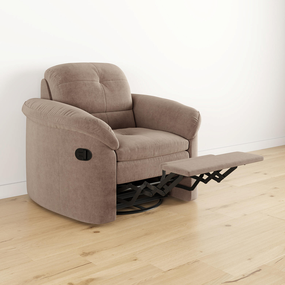 Идеальное место для отдыха - кресло «Коннери» с современным механизмом «Глайдер» от компании «LEGGET & PLATT», который превращает обычное кресло в кресло-качалку или раскладывает его в положение «релакс». Такая реализация обеспечивает максимальный комфорт и подходит для ежедневного использования. Режим «кресло-качалка» позволяет поворачивать кресло на 360 градусов, но отключается при его раскладывании. Положение кресла меняется с помощью небольшого усилия при поднятии рычага, находящегося на подлокотнике, и надавливании на спинку. При опускании спинки выдвигается удобная подставка для ног.
