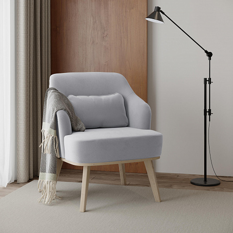 Кресло «Ноа» — минималистичная модель идеально подойдет для создания уютной зоны отдыха. Кресло в скандинавском стиле выделяется высокой спинкой, плавно перетекающей в подлокотники. Лаконичный образ завершает деревянное основание с тонкими опорами. Небольшая декоративная подушка поможет скорректировать глубину посадки для более комфортного отдыха.