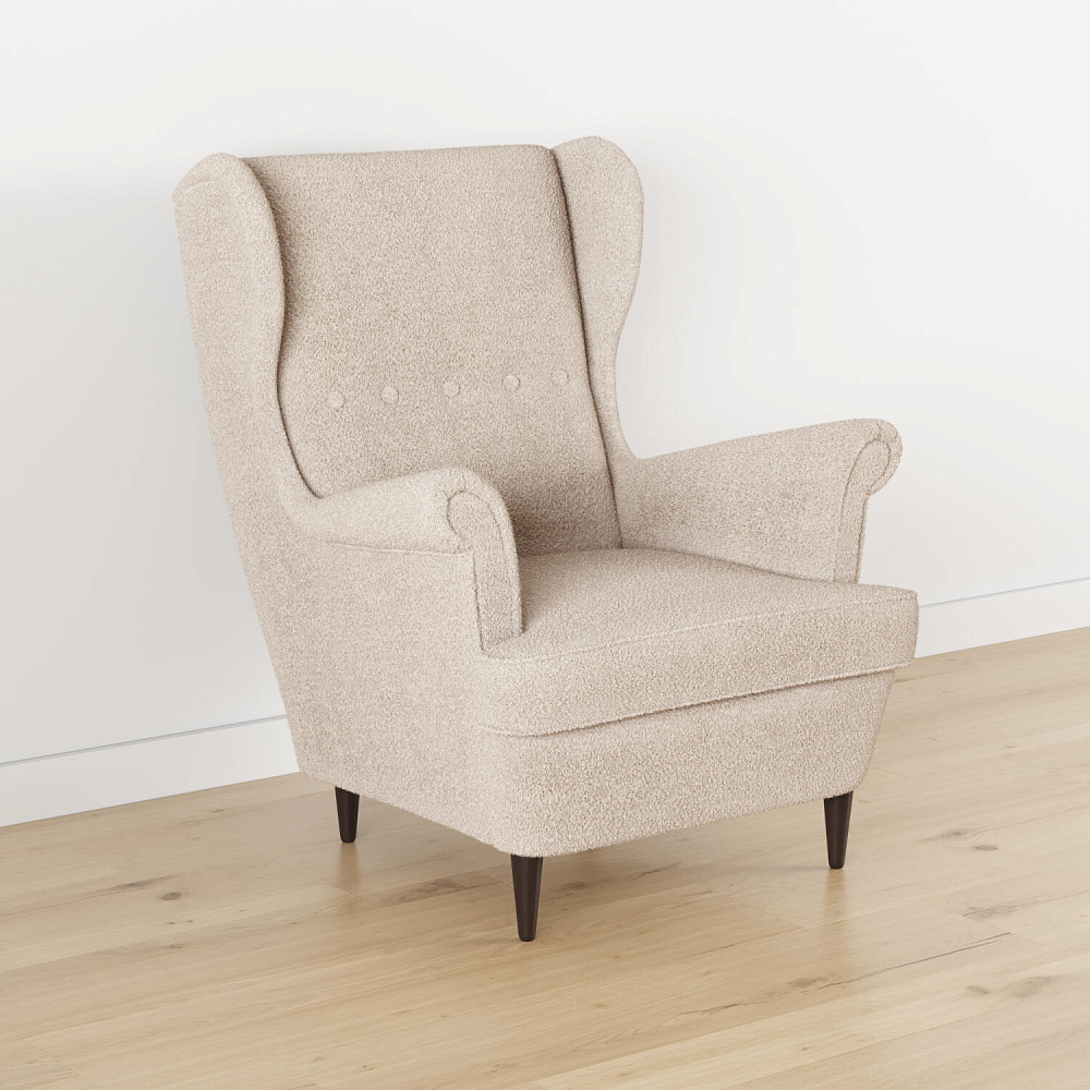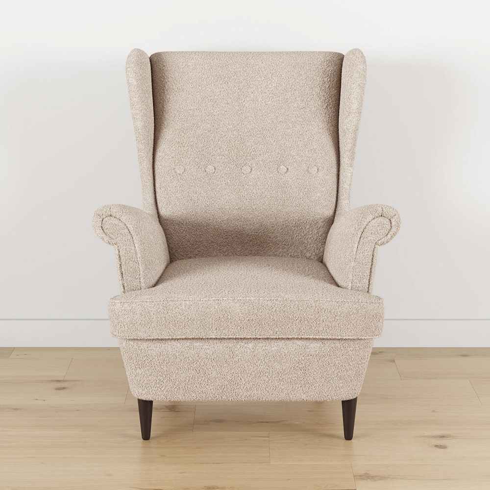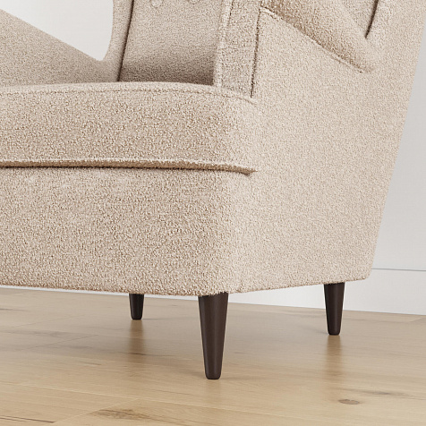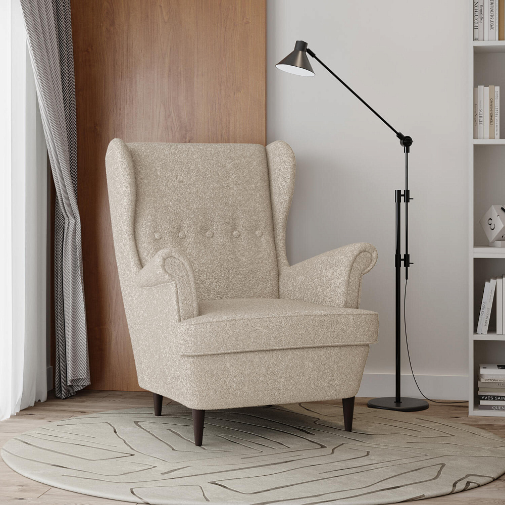 Модное кресло «Редфорд» удачно впишется в пространство любых интерьеров. Декоративные пуговицы и кант на подлокотниках, спинке и подушке придают изделию особую изысканность и утонченность. Кресло имеет глубокую посадку и высокую, элегантно изогнутую спинку, что усиливает комфорт во время отдыха. Мягкая обивка модели выполнена из ткани букле. Зернистая неоднородная фактура материала создает многослойный визуальный эффект. Ткань плавно повторяет мебельные формы, смягчая острые углы и подчеркивая округлые элементы. Задняя часть спинки выполнена в той же обивке, что и основная, позволяя расположить кресло в центре комнаты. Ножки оснащаются полипропиленовыми накладками, защищающими напольное покрытие от повреждений.