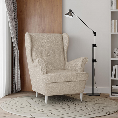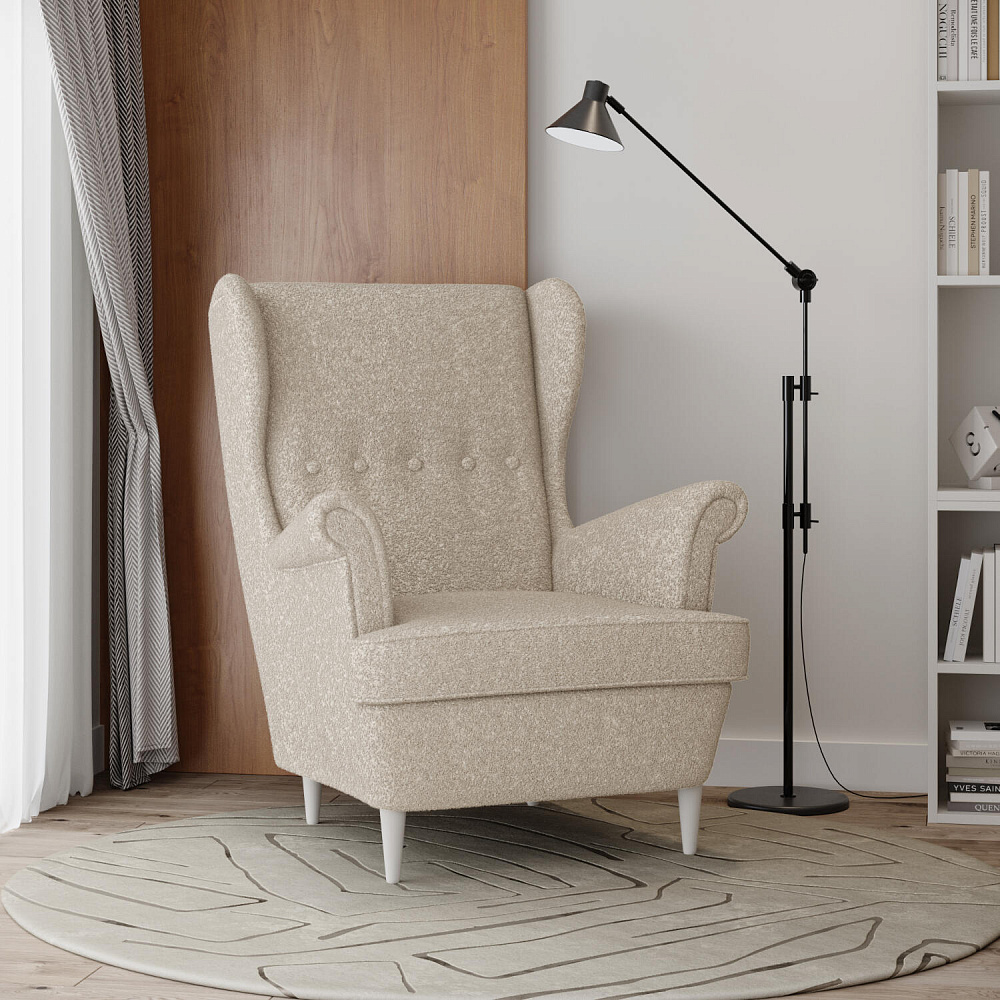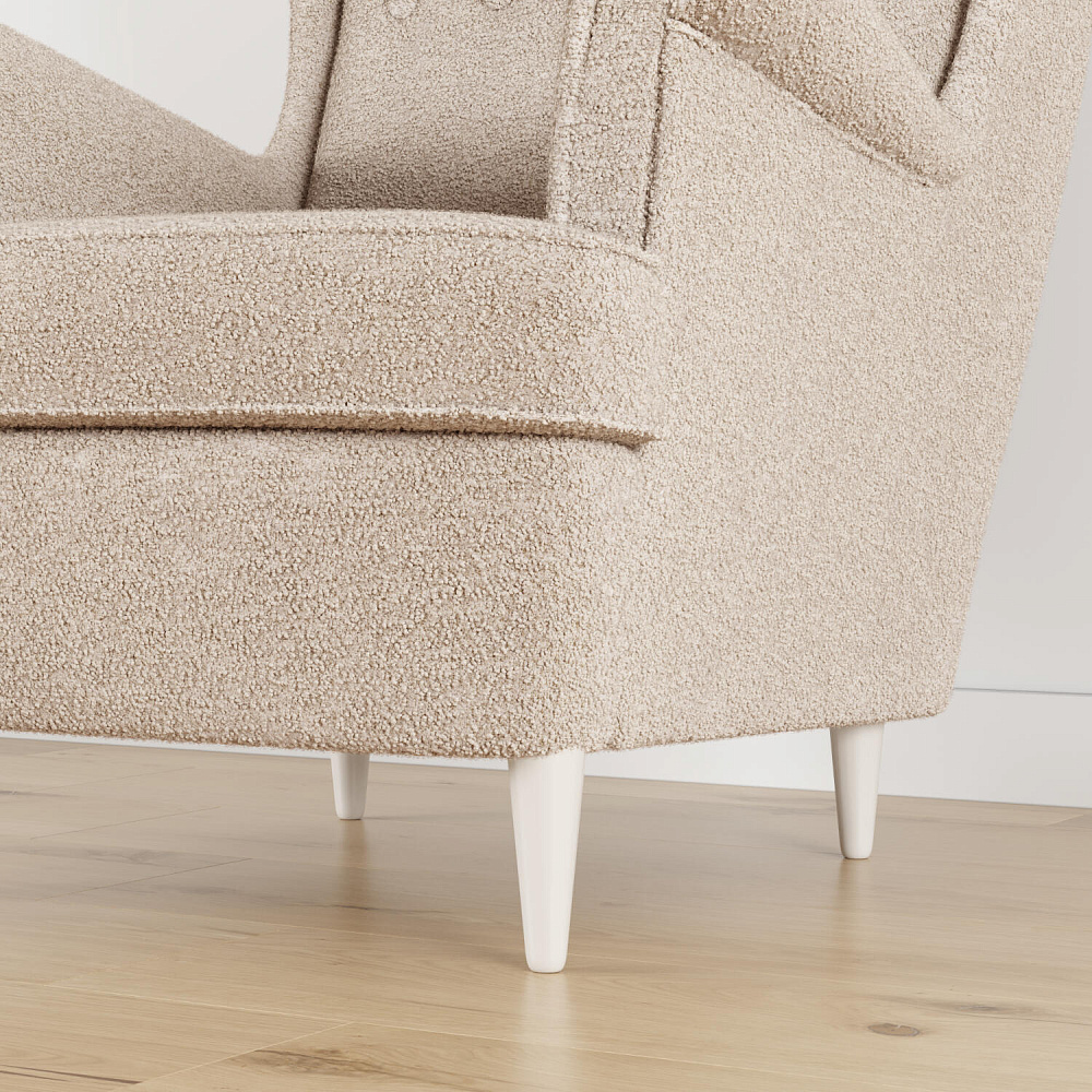 Модное кресло «Редфорд» удачно впишется в пространство любых интерьеров. Декоративные пуговицы и кант на подлокотниках, спинке и подушке придают изделию особую изысканность и утонченность. Кресло имеет глубокую посадку и высокую, элегантно изогнутую спинку, что усиливает комфорт во время отдыха. Мягкая обивка модели выполнена из ткани букле. Зернистая неоднородная фактура материала создает многослойный визуальный эффект. Ткань плавно повторяет мебельные формы, смягчая острые углы и подчеркивая округлые элементы. Задняя часть спинки выполнена в той же обивке, что и основная, позволяя расположить кресло в центре комнаты. Ножки оснащаются полипропиленовыми накладками, защищающими напольное покрытие от повреждений.