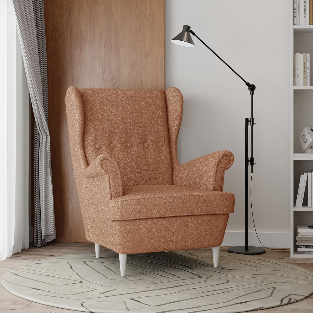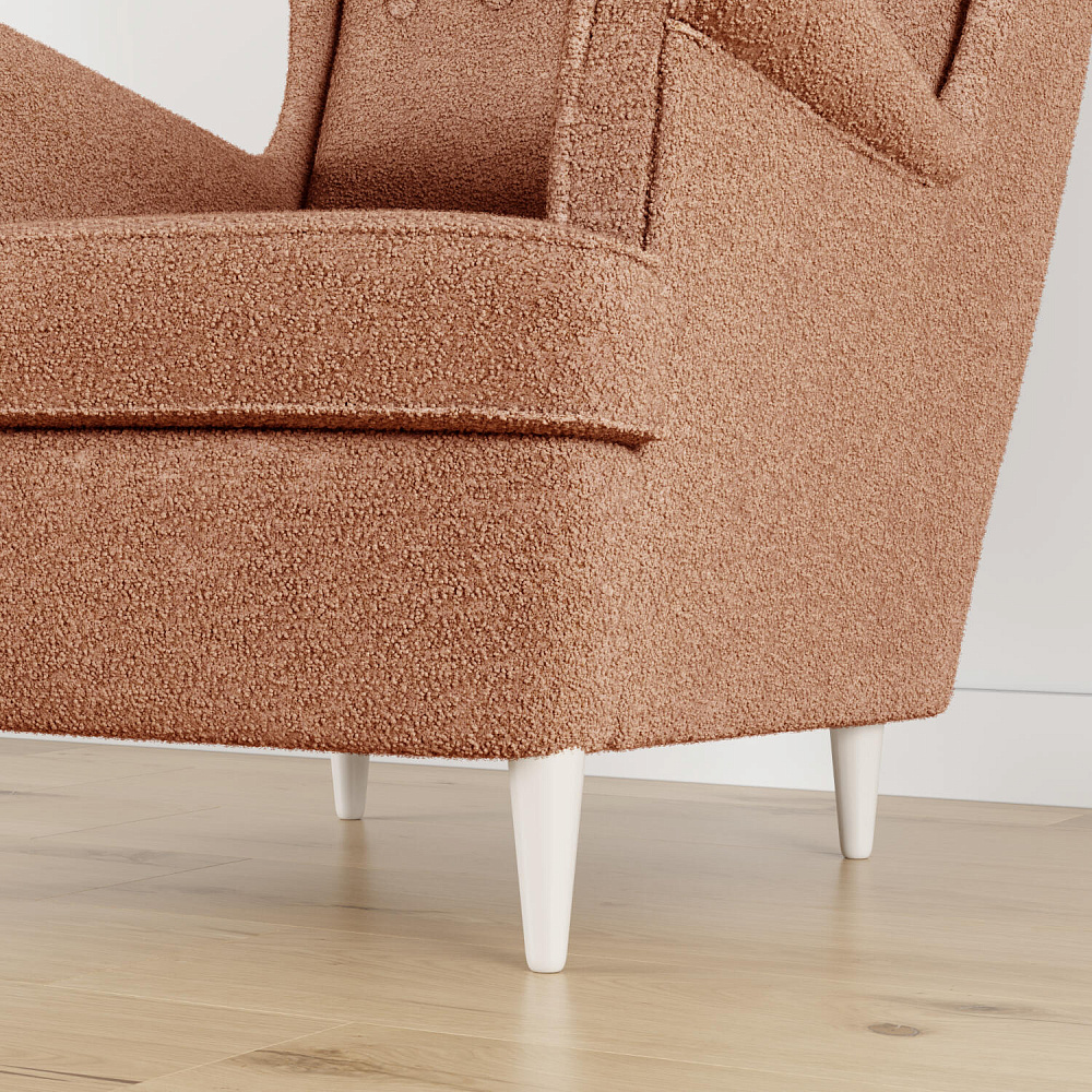 Модное кресло «Редфорд» удачно впишется в пространство любых интерьеров. Декоративные пуговицы и кант на подлокотниках, спинке и подушке придают изделию особую изысканность и утонченность. Кресло имеет глубокую посадку и высокую, элегантно изогнутую спинку, что усиливает комфорт во время отдыха. Мягкая обивка модели выполнена из ткани букле. Зернистая неоднородная фактура материала создает многослойный визуальный эффект. Ткань плавно повторяет мебельные формы, смягчая острые углы и подчеркивая округлые элементы. Задняя часть спинки выполнена в той же обивке, что и основная, позволяя расположить кресло в центре комнаты. Ножки оснащаются полипропиленовыми накладками, защищающими напольное покрытие от повреждений.