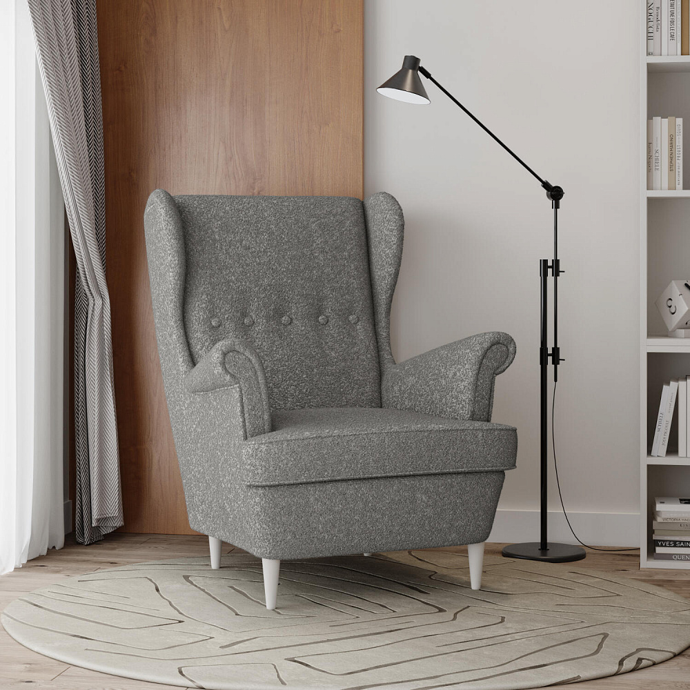 Модное кресло «Редфорд» удачно впишется в пространство любых интерьеров. Декоративные пуговицы и кант на подлокотниках, спинке и подушке придают изделию особую изысканность и утонченность. Кресло имеет глубокую посадку и высокую, элегантно изогнутую спинку, что усиливает комфорт во время отдыха. Мягкая обивка модели выполнена из ткани букле. Зернистая неоднородная фактура материала создает многослойный визуальный эффект. Ткань плавно повторяет мебельные формы, смягчая острые углы и подчеркивая округлые элементы. Задняя часть спинки выполнена в той же обивке, что и основная, позволяя расположить кресло в центре комнаты. Ножки оснащаются полипропиленовыми накладками, защищающими напольное покрытие от повреждений.