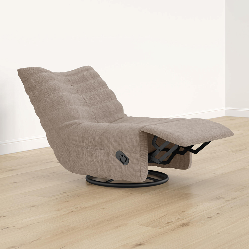 Положение «релакс». Для трансформации в положение полулежа необходимо вытянуть рычаг на боковой части кресла и надавить на спинку. Затем выдвинется удобная подставка для ног.