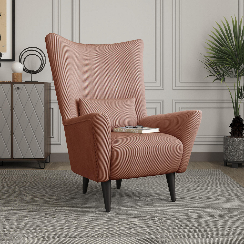 Удобное кресло «Дублин» с декоративной подушкой гармонично сочетается с особенностями любого интерьера. Дизайн модели — это единство плавных форм и линий, лаконичности и изысканности. Особый шарм обеспечивается за счёт вогнутой формы спинки и элегантных подлокотников, обеспечивающих высокий комфорт во время посадки. Благодаря высоким ножкам из натурального дерева, кресло словно парит в воздухе, в некоторой степени облегчая интерьер гостиной или спальни.