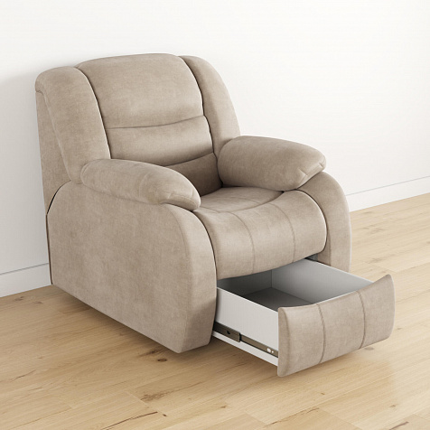 Удобное кресло «Ридберг» с ящиком будет для вас не только местом для отдыха, но и зоной для хранения белья и личных вещей. Ящик легко открывается с помощью надежного выкатного механизма на шариковых направляющих.