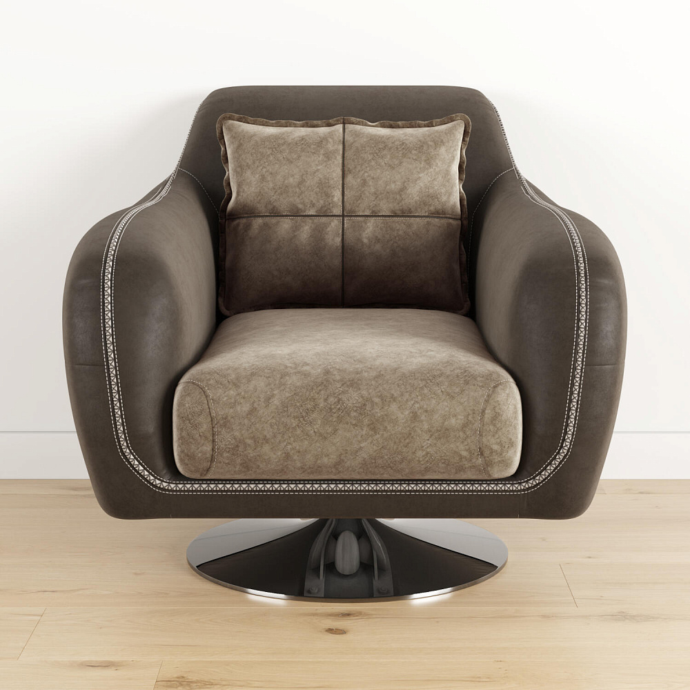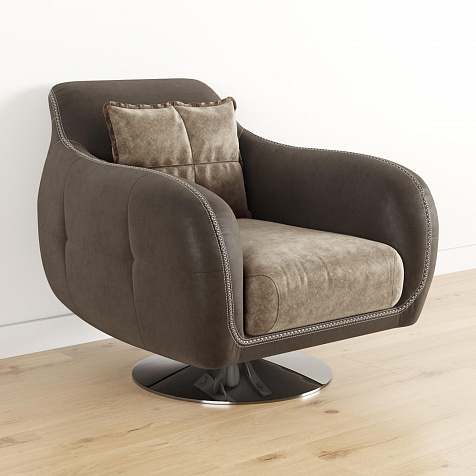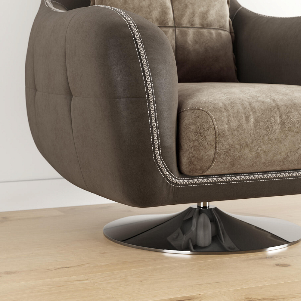 Комфортное кресло из коллекции «Неаполь» идеально подходит для использования в качестве интерьерного акцента, способного удовлетворить вкус даже самого взыскательного клиента. Вместе с другими моделями коллекции кресло позволит создать в помещении целый мебельный ансамбль, сочетающийся изяществом линий и оригинальностью форм. Приспинная подушка придаёт модели особую мягкость, позволяя регулировать глубину посадки. Оригинальная хромированная ножка кресла, являющаяся опорой, обеспечивает вращение на 360°. Для обивки спинки, подлокотников и царги используется искусственная замша «Tesoro». Выигрышный внешний вид «Tesoro» радует глаз приятной игрой оттенков. Каждое прикосновение к его благородной бархатистой фактуре приносит истинное удовольствие.