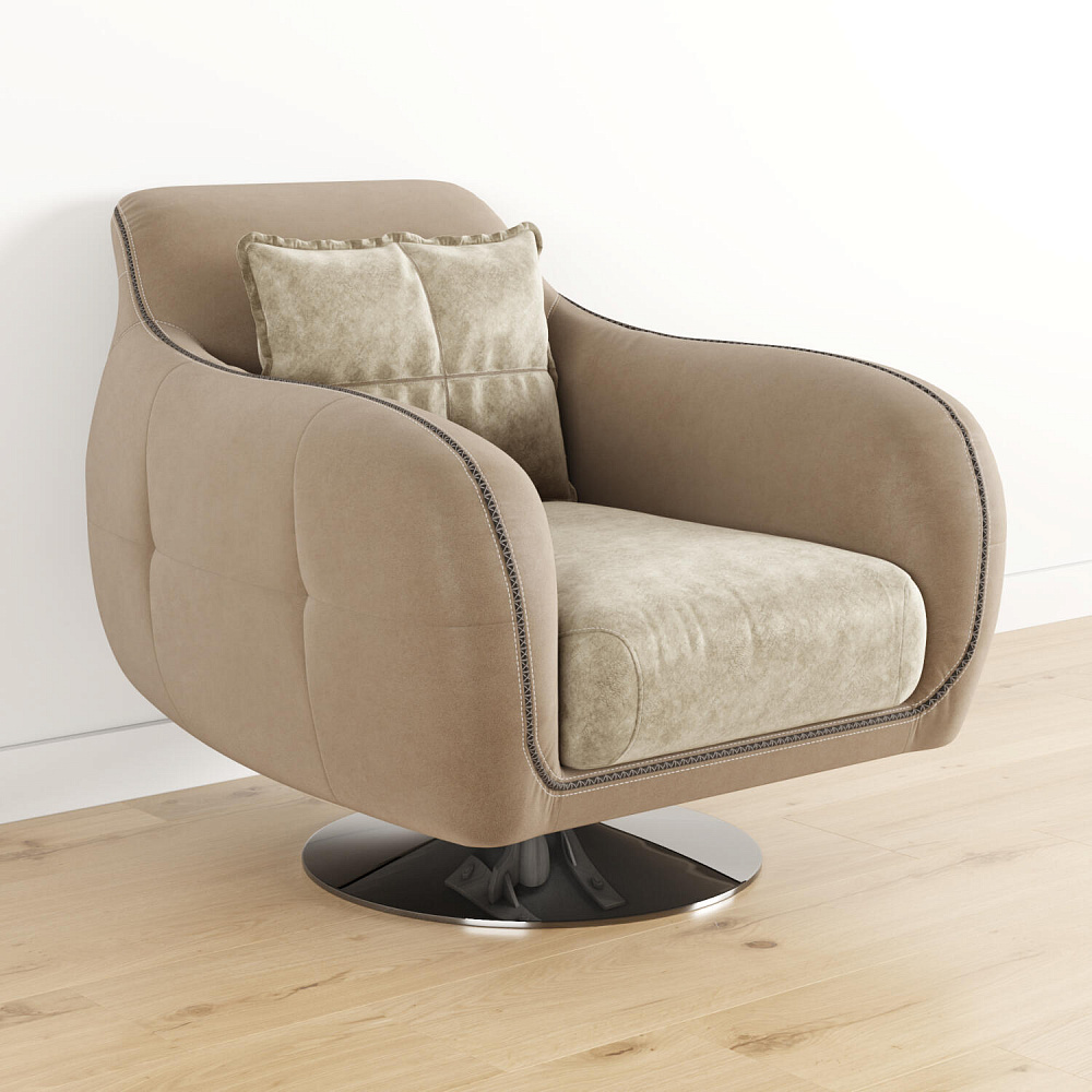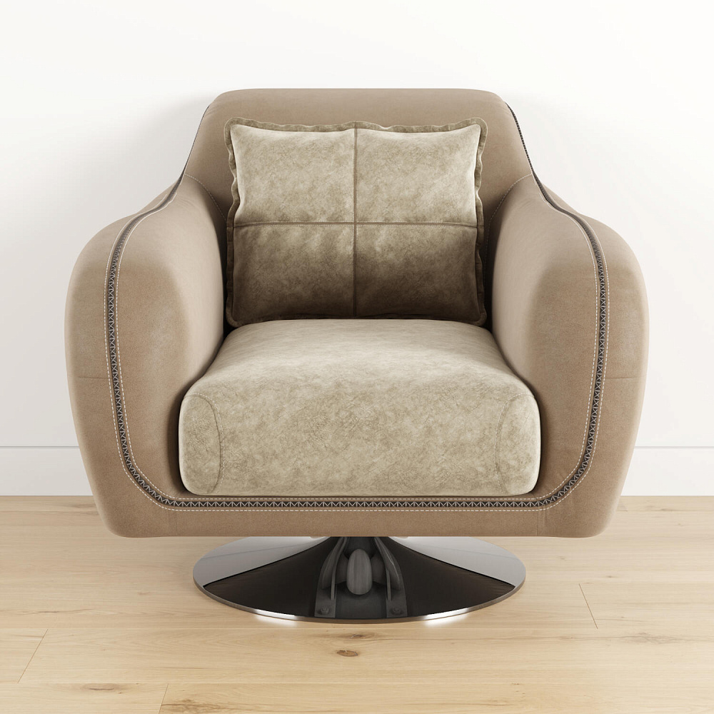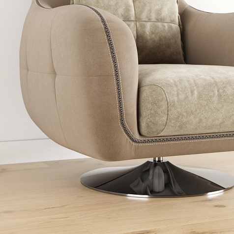 Комфортное кресло из коллекции «Неаполь» идеально подходит для использования в качестве интерьерного акцента, способного удовлетворить вкус даже самого взыскательного клиента. Вместе с другими моделями коллекции кресло позволит создать в помещении целый мебельный ансамбль, сочетающийся изяществом линий и оригинальностью форм. Приспинная подушка придаёт модели особую мягкость, позволяя регулировать глубину посадки. Оригинальная хромированная ножка кресла, являющаяся опорой, обеспечивает вращение на 360°. Для обивки спинки, подлокотников и царги используется искусственная замша «Tesoro». Выигрышный внешний вид «Tesoro» радует глаз приятной игрой оттенков. Каждое прикосновение к его благородной бархатистой фактуре приносит истинное удовольствие.