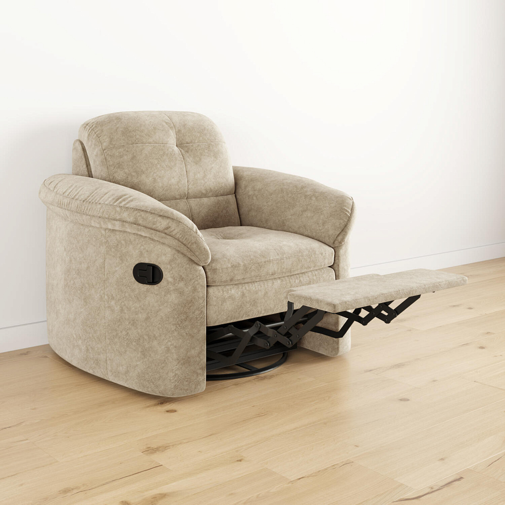 Идеальное место для отдыха - кресло «Коннери» с современным механизмом «Глайдер» от компании «LEGGET & PLATT», который превращает обычное кресло в кресло-качалку или раскладывает его в положение «релакс». Такая реализация обеспечивает максимальный комфорт и подходит для ежедневного использования. Режим «кресло-качалка» позволяет поворачивать кресло на 360 градусов, но отключается при его раскладывании. Положение кресла меняется с помощью небольшого усилия при поднятии рычага, находящегося на подлокотнике, и надавливании на спинку. При опускании спинки выдвигается удобная подставка для ног.