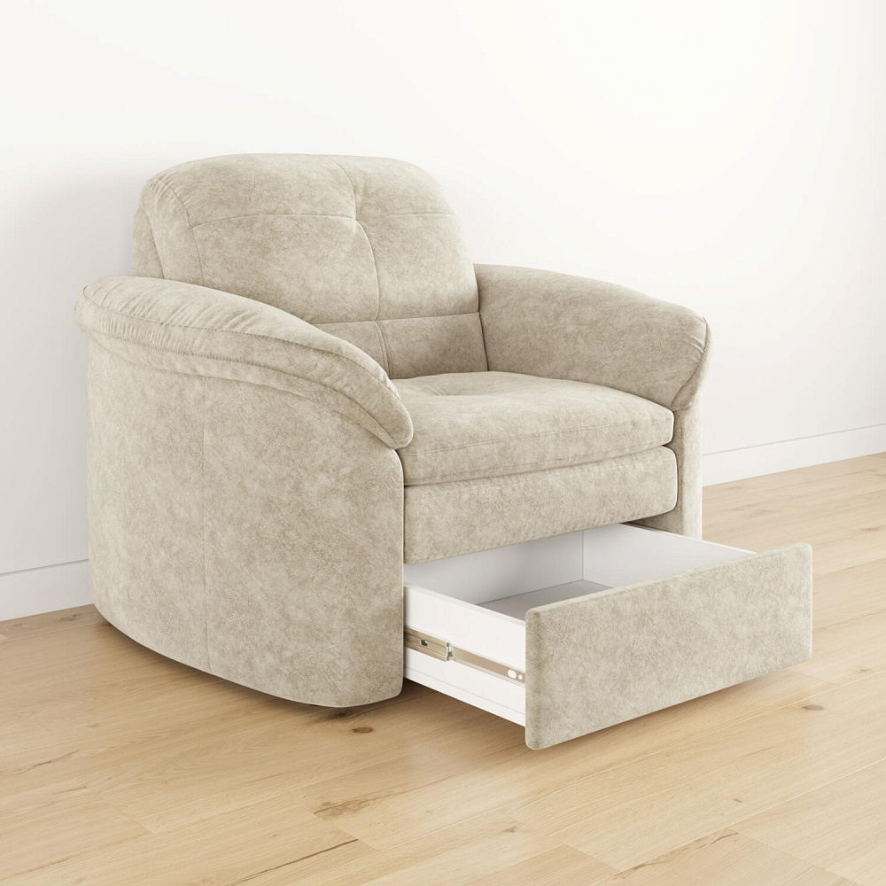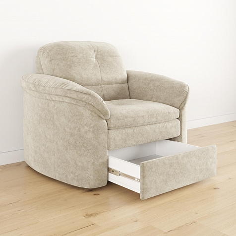 Кресло с ящиком «Коннери» будет не только удобным местом для отдыха, но и зоной для хранения личных вещей. Сиденье кресла за счет особых эргономических свойств отличается комфортом. Под основанием находится ящик для хранения белья, который легко открывается с помощью надежного выкатного механизма на шариковых направляющих.