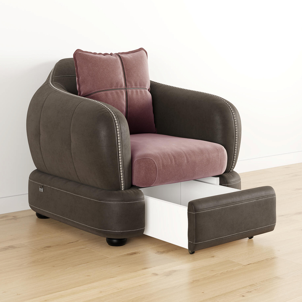 Комфортное, функциональное кресло «Неаполь» с ящиком позволит создать в помещении идеальную мебельную композицию, отличающуюся изяществом линий и оригинальностью форм. Кресло дополнено коробом для хранения вещей, который открывается при помощи усиленных металлических направляющих, обеспечивающих полное выдвижение. Для обивки спинки, подлокотников и царги используется искусственная замша «Tesoro». Выигрышный внешний вид «Tesoro» радует глаз приятной игрой оттенков. Каждое прикосновение к его благородной бархатистой фактуре приносит истинное удовольствие.