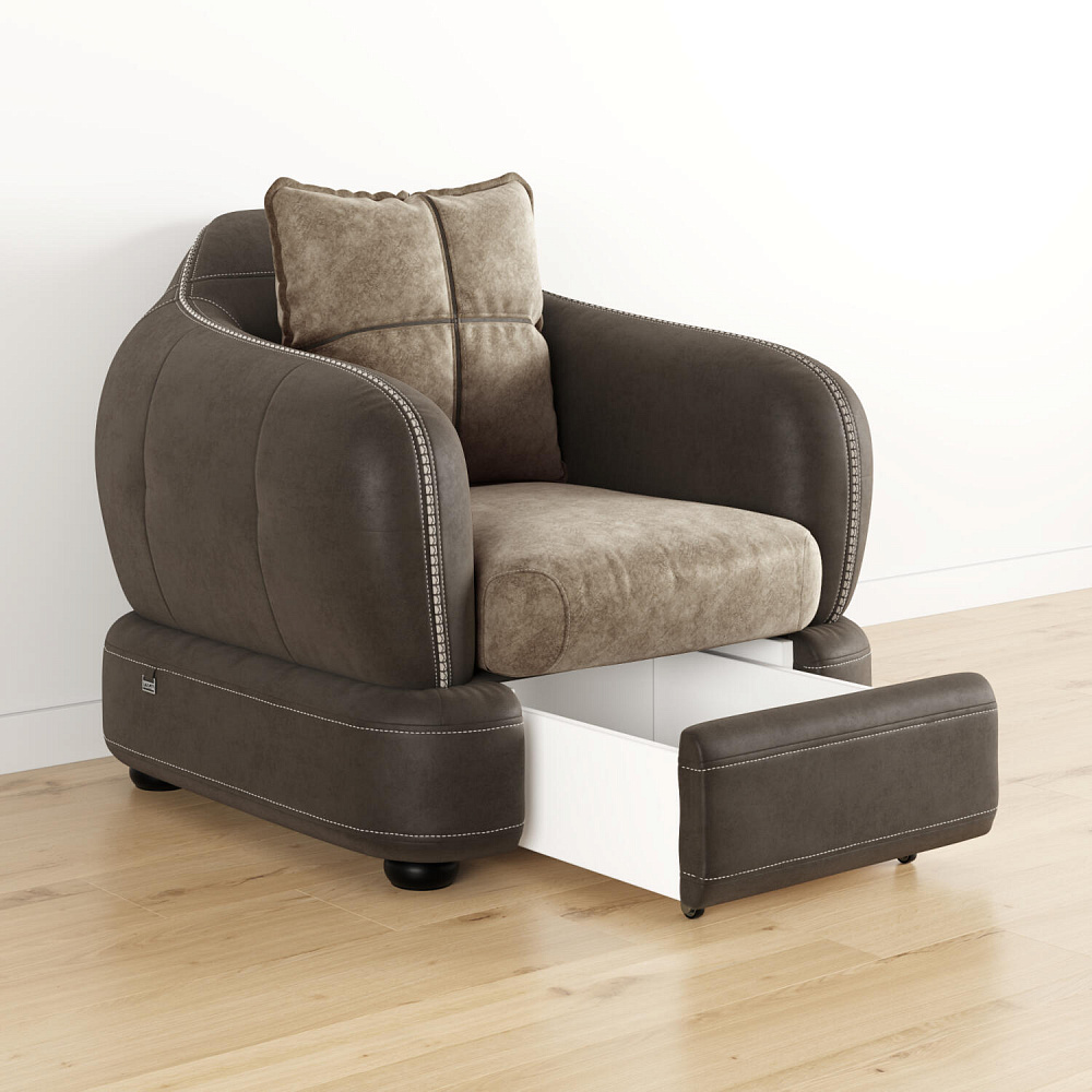 Комфортное, функциональное кресло «Неаполь» с ящиком позволит создать в помещении идеальную мебельную композицию, отличающуюся изяществом линий и оригинальностью форм. Кресло дополнено коробом для хранения вещей, который открывается при помощи усиленных металлических направляющих, обеспечивающих полное выдвижение. Для обивки спинки, подлокотников и царги используется искусственная замша «Tesoro». Выигрышный внешний вид «Tesoro» радует глаз приятной игрой оттенков. Каждое прикосновение к его благородной бархатистой фактуре приносит истинное удовольствие.