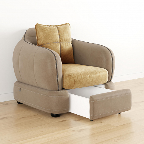 Комфортное, функциональное кресло «Неаполь» с ящиком позволит создать в помещении идеальную мебельную композицию, отличающуюся изяществом линий и оригинальностью форм. Кресло дополнено коробом для хранения вещей, который открывается при помощи усиленных металлических направляющих, обеспечивающих полное выдвижение. Для обивки спинки, подлокотников и царги используется искусственная замша «Tesoro». Выигрышный внешний вид «Tesoro» радует глаз приятной игрой оттенков. Каждое прикосновение к его благородной бархатистой фактуре приносит истинное удовольствие.