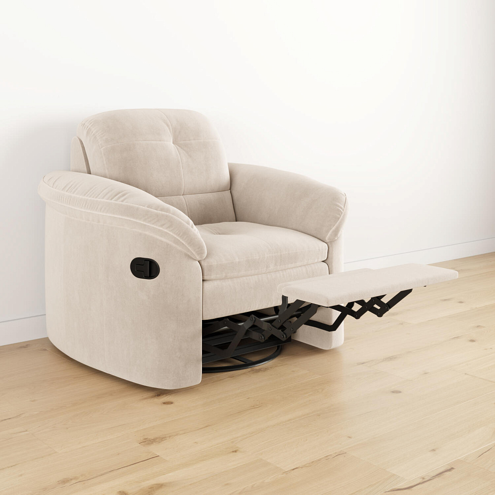 Идеальное место для отдыха - кресло «Коннери» с современным механизмом «Глайдер» от компании «LEGGET & PLATT», который превращает обычное кресло в кресло-качалку или раскладывает его в положение «релакс». Такая реализация обеспечивает максимальный комфорт и подходит для ежедневного использования. Режим «кресло-качалка» позволяет поворачивать кресло на 360 градусов, но отключается при его раскладывании. Положение кресла меняется с помощью небольшого усилия при поднятии рычага, находящегося на подлокотнике, и надавливании на спинку. При опускании спинки выдвигается удобная подставка для ног.