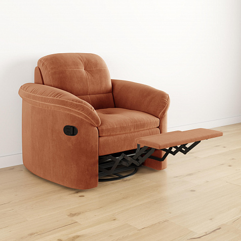 Идеальное место для отдыха - кресло «Коннери» с современным механизмом «Глайдер» от компании «LEGGET & PLATT», который превращает обычное кресло в кресло-качалку или раскладывает его в положение «релакс». Такая реализация обеспечивает максимальный комфорт и подходит для ежедневного использования. Режим «кресло-качалка» позволяет поворачивать кресло на 360 градусов, но отключается при его раскладывании. Положение кресла меняется с помощью небольшого усилия при поднятии рычага, находящегося на подлокотнике, и надавливании на спинку. При опускании спинки выдвигается удобная подставка для ног.