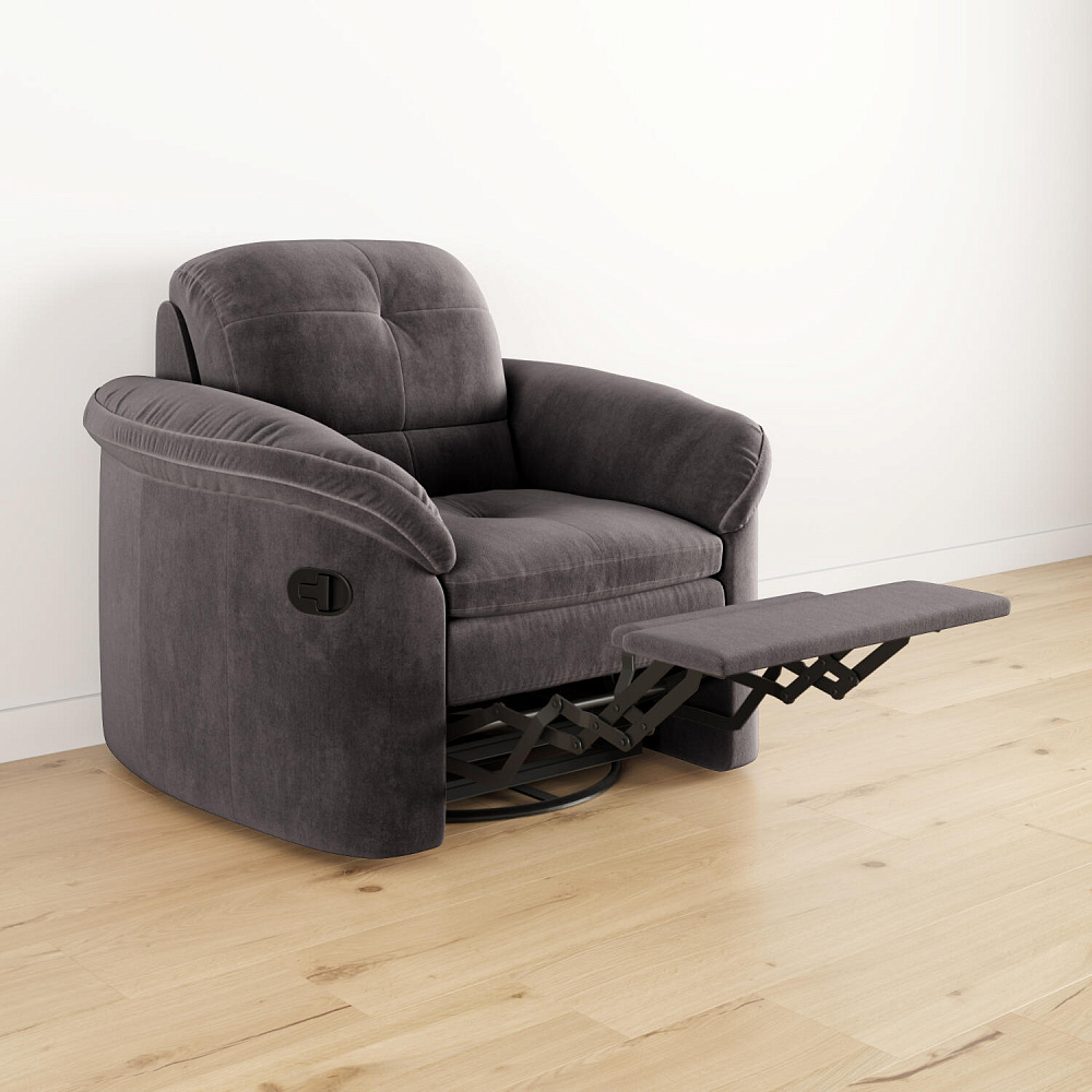 Идеальное место для отдыха - кресло «Коннери» с современным механизмом «Глайдер» от компании «LEGGET & PLATT», который превращает обычное кресло в кресло-качалку или раскладывает его в положение «релакс». Такая реализация обеспечивает максимальный комфорт и подходит для ежедневного использования. Режим «кресло-качалка» позволяет поворачивать кресло на 360 градусов, но отключается при его раскладывании. Положение кресла меняется с помощью небольшого усилия при поднятии рычага, находящегося на подлокотнике, и надавливании на спинку. При опускании спинки выдвигается удобная подставка для ног.