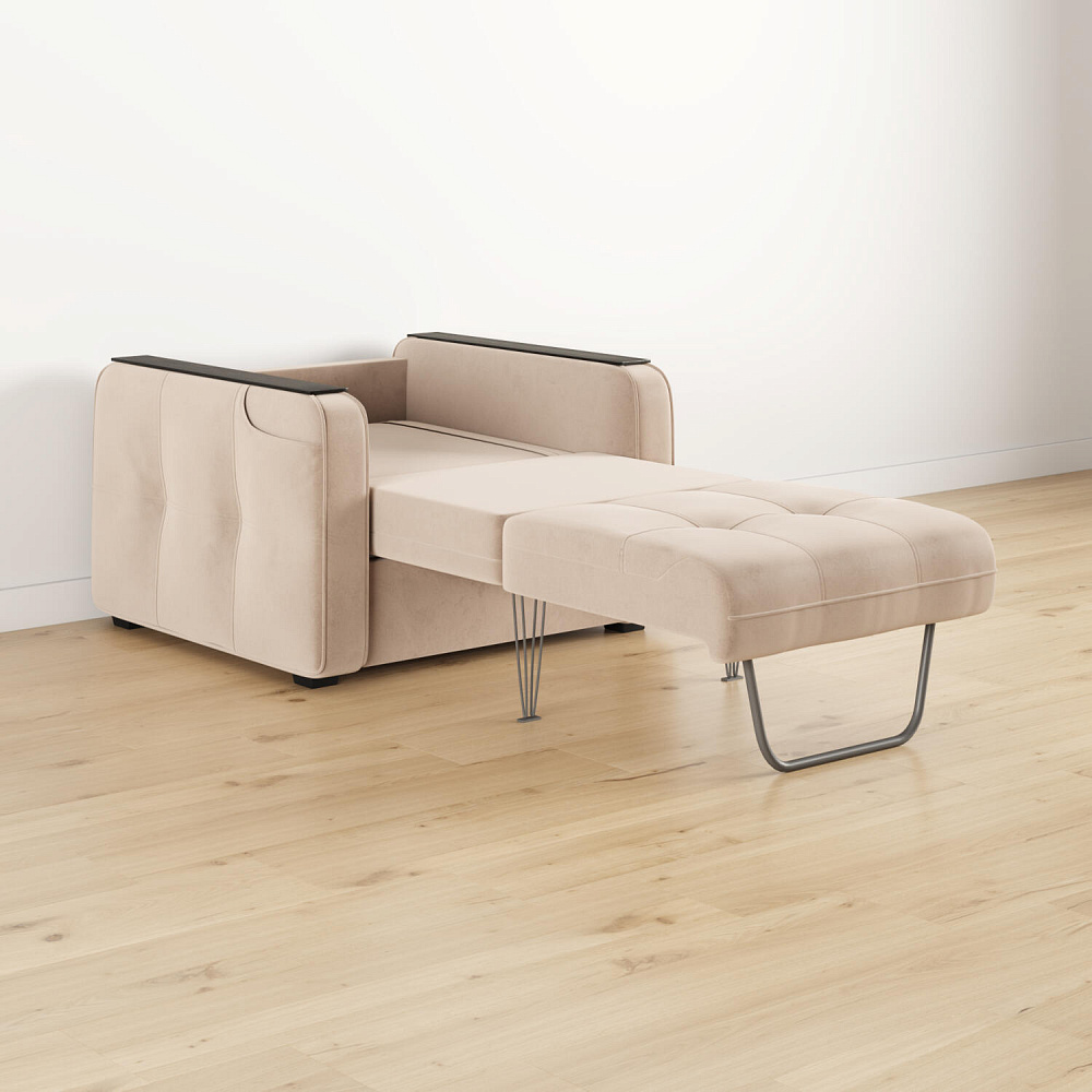 Односпальное место. Кресло раскладывается в односпальную кровать с помощью механизма трансформации «Каскад». Полноценная кровать прекрасно подойдёт в качестве гостевого варианта.
