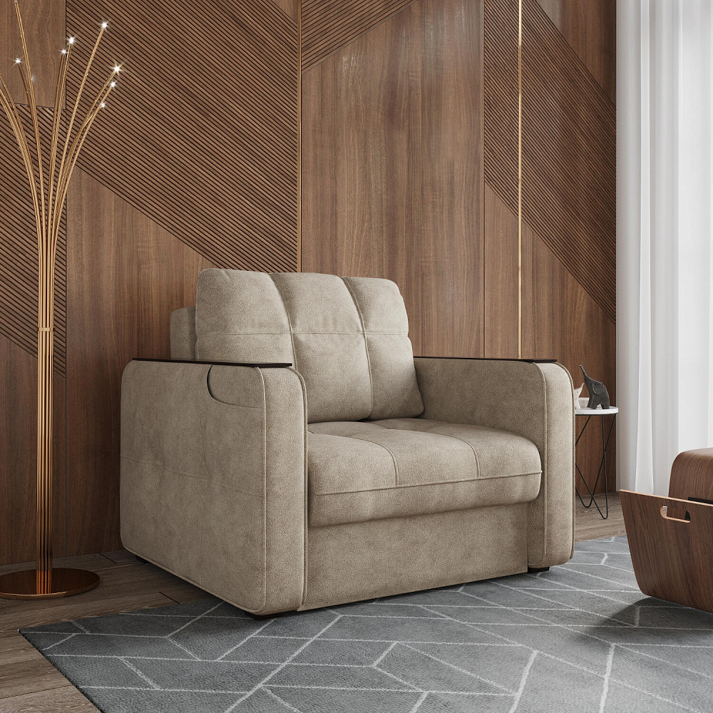 Кресло-кровать «Киль» подойдёт любителям посидеть с чашечкой кофе перед телевизором. Помимо односпального места и бельевого ящика модель оснащена накладками на подлокотниках, на которые удобно поставить кружку. Также на подлокотнике есть карман, чтобы смартфон или книга были всегда под рукой. Многофункциональное кресло не перегружено декором, поэтому подойдёт к большинству современных интерьеров.