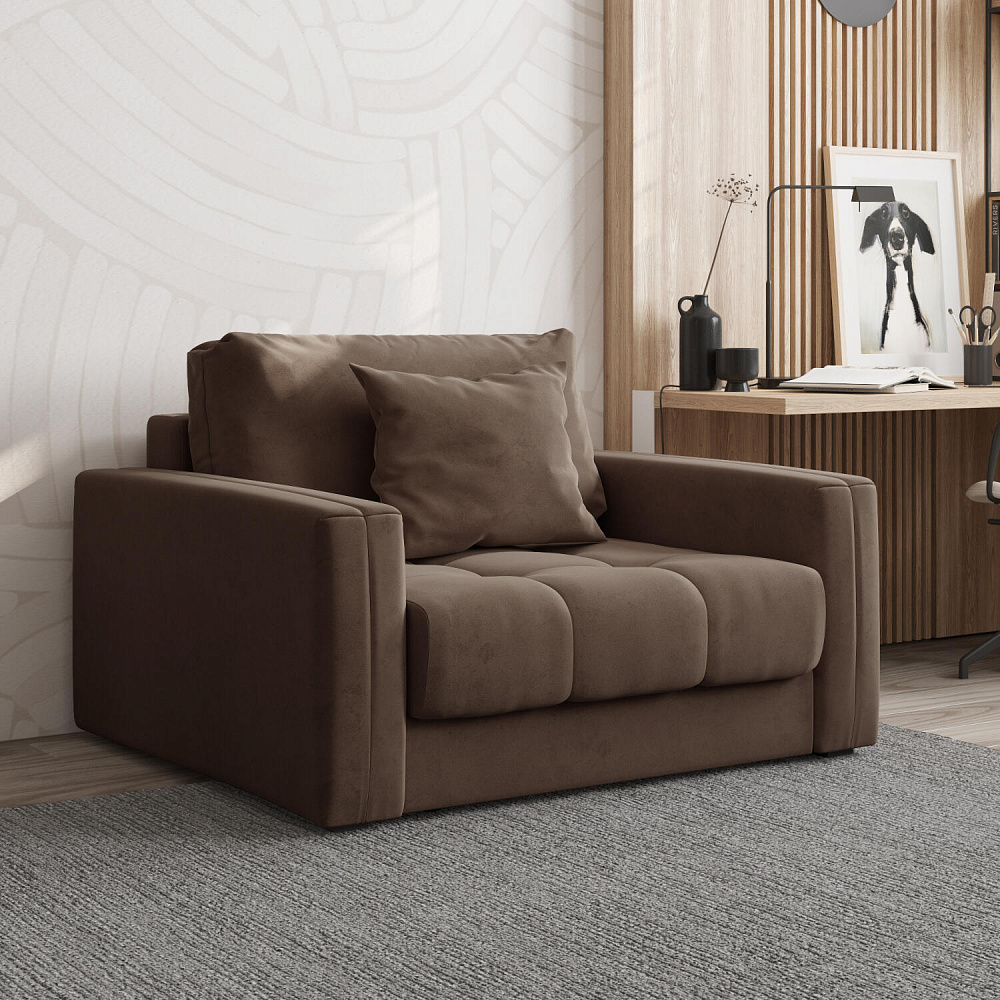 Кресло-кровать «Дензел» — лучшее сочетание компактности и функциональности в современном стиле. Кресло обладает глубокой посадкой, а подушки позволяют создать удобное место для отдыха. Спинка модели выполнена в обивочной ткани, что позволяет использовать кресло-кровать для зонирования комнаты.