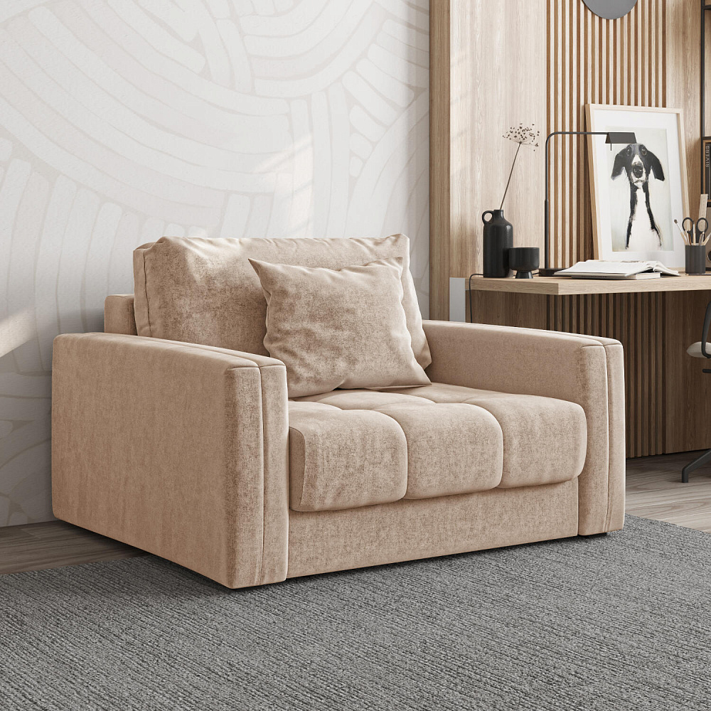 Кресло-кровать «Дензел» — лучшее сочетание компактности и функциональности в современном стиле. Кресло обладает глубокой посадкой, а подушки позволяют создать удобное место для отдыха. Спинка модели выполнена в обивочной ткани, что позволяет использовать кресло-кровать для зонирования комнаты.