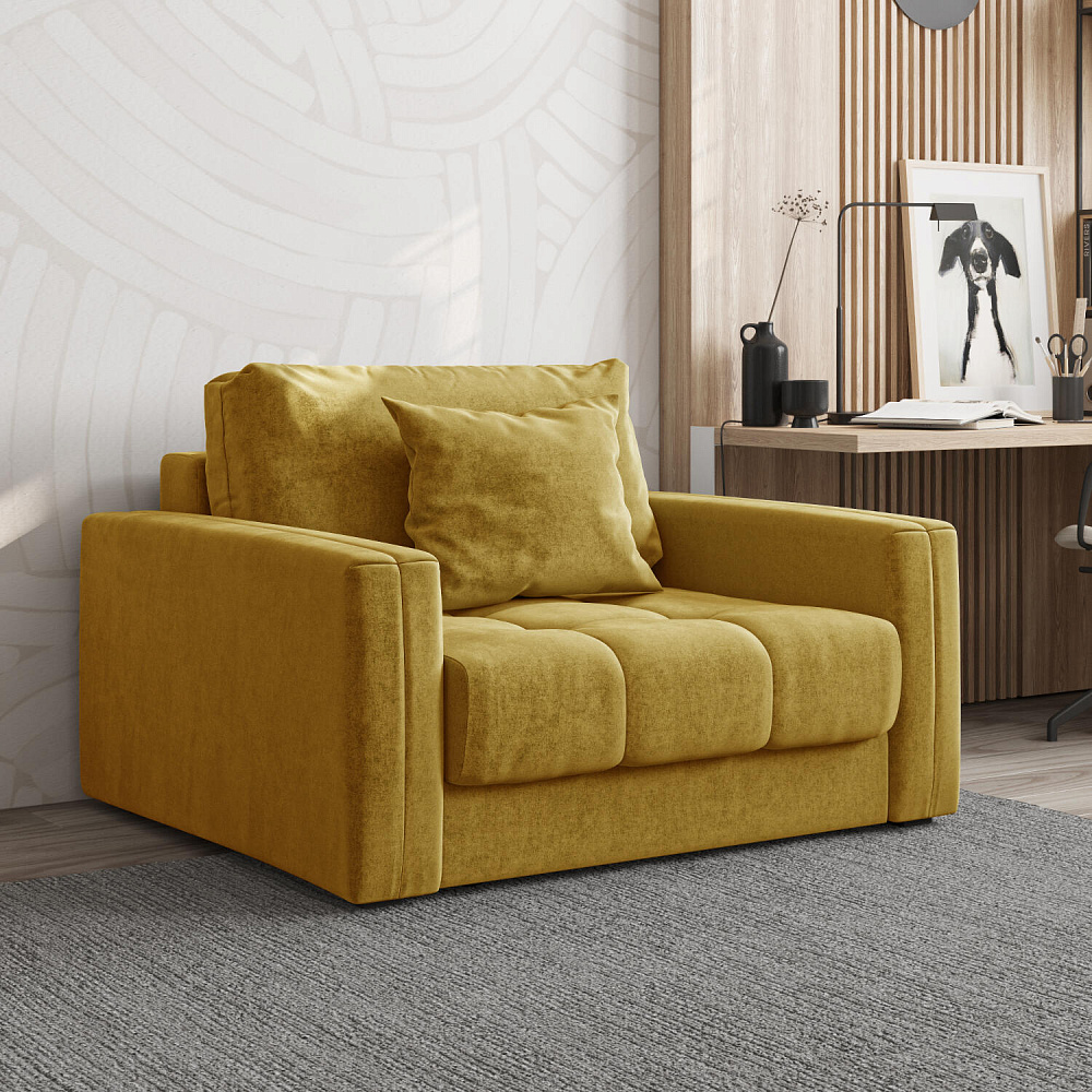 Кресло-кровать «Дензел» — лучшее сочетание компактности и функциональности в современном стиле. Кресло обладает глубокой посадкой, а подушки позволяют создать удобное место для отдыха. Спинка модели выполнена в обивочной ткани, что позволяет использовать кресло-кровать для зонирования комнаты.