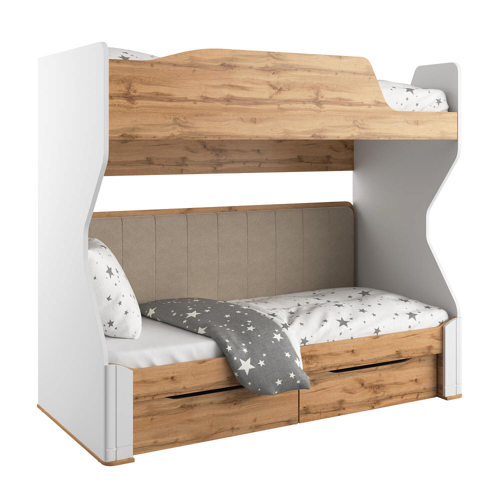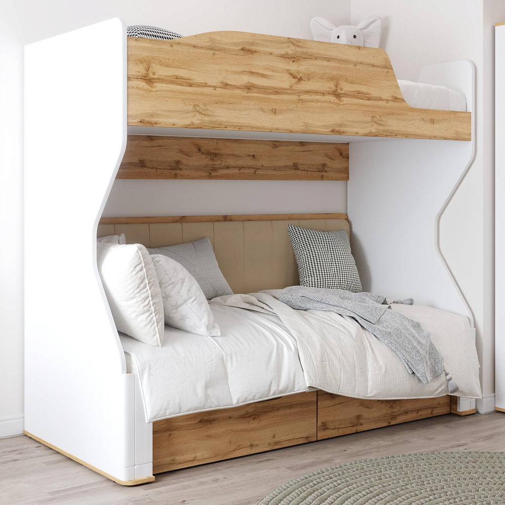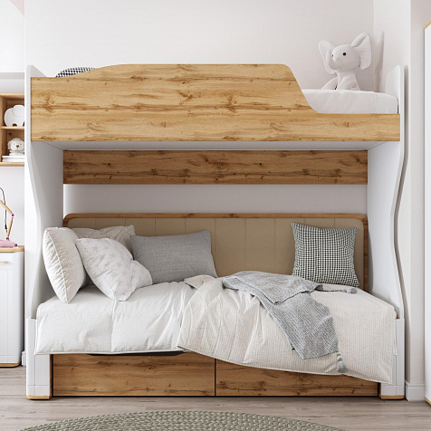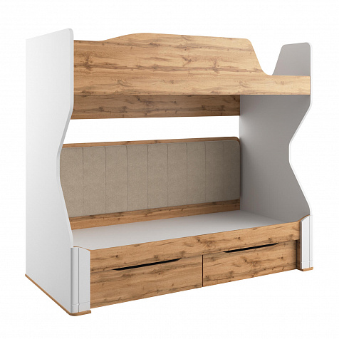 Двухъярусная кровать «Кассия» займёт центральное место в интерьере детской. Приятное сочетание белых стенок, древесного декора панелей наполнит пространство комнаты светом и теплом. Продуманные размеры верхнего и нижнего спального места при наличии удобных матрасов обеспечат максимально спокойный и полезный отдых ваших детей, а выдвижные ящики помогут компактно разместить постельное бельё.