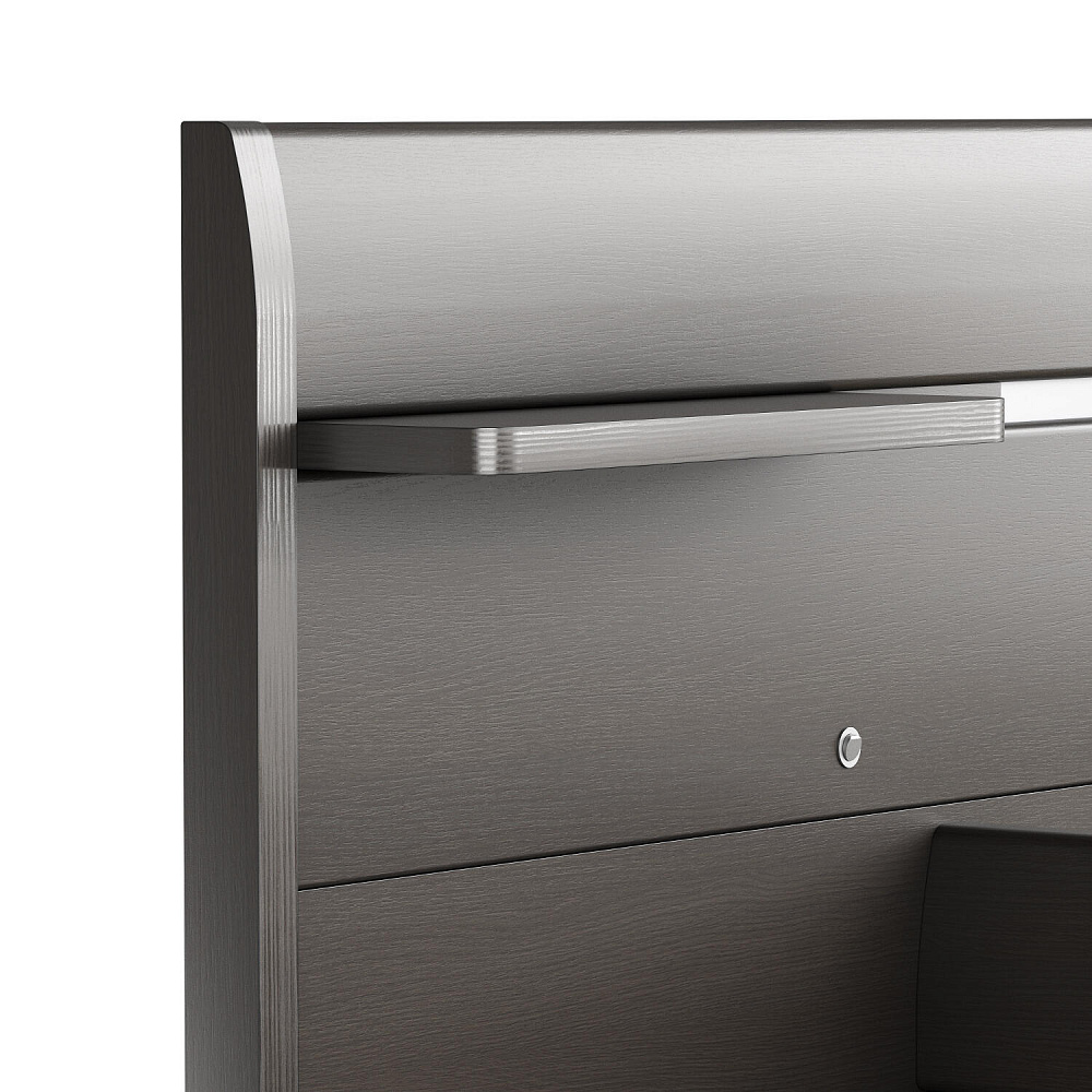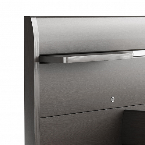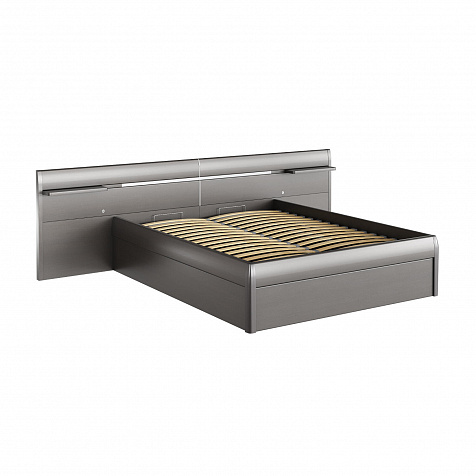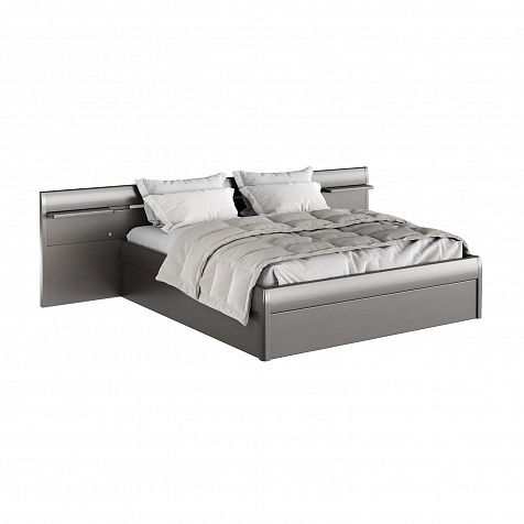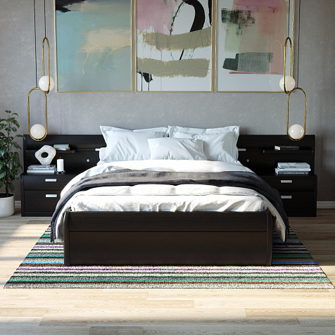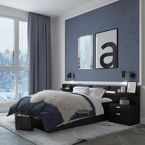 Широкое изголовье с полочками. Оригинальная спинка выходит за границы кровати и позволяет четко обозначить зону для сна. С каждой стороны от кровати вверху располагаются полочки для хранения мелочей.