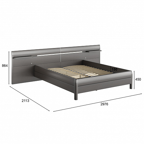 Широкое изголовье с полочками. Оригинальная спинка выходит за границы кровати и позволяет четко обозначить зону для сна. С каждой стороны от кровати вверху располагаются полочки для хранения мелочей.