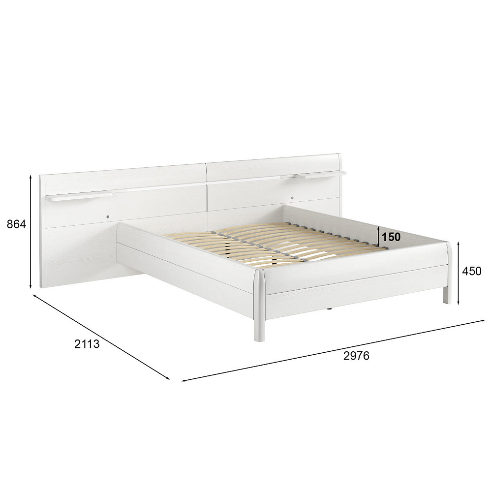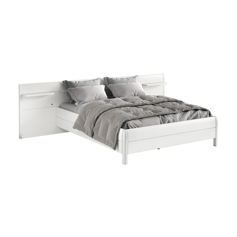 Широкое изголовье с полочками. Оригинальная спинка выходит за границы кровати и позволяет четко обозначить зону для сна. С каждой стороны от кровати вверху располагаются полочки для хранения мелочей.