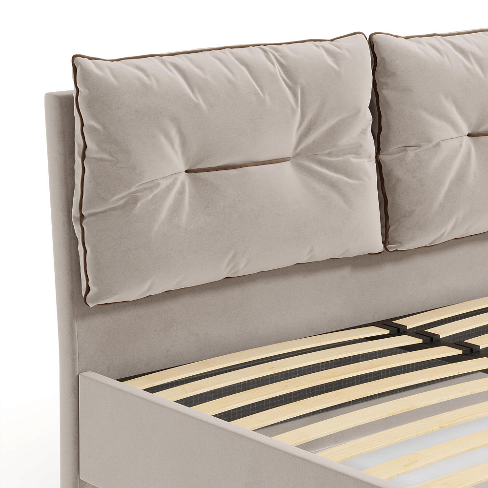 Кровать «Санремо» со съёмными подушками на изголовье — уютнейший вариант оформления спальни. Контрастный кант и внутренний шов придают подушкам дополнительный объем. При необходимости подушки легко снимаются, ведь они крепятся к изголовью на липучках. «Санремо» подарит невероятный комфорт и уют своим владельцам.
