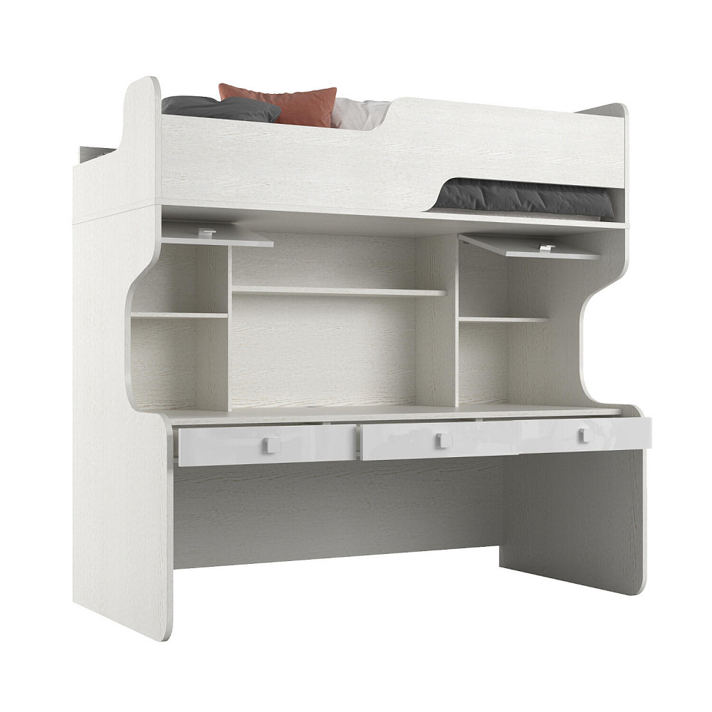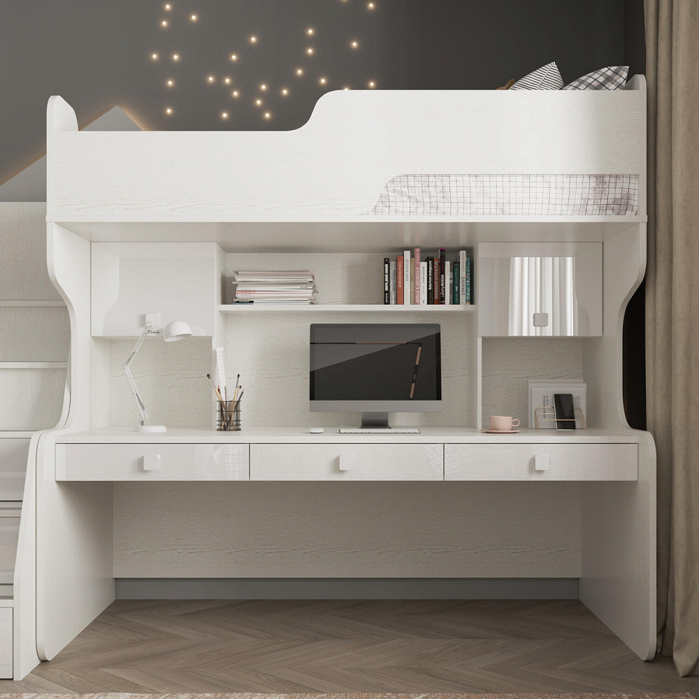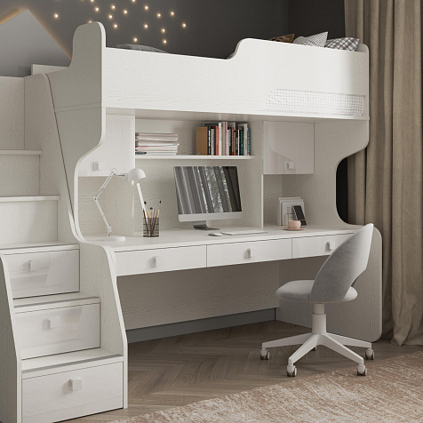 Продуманная двухместная рабочая зона с системой хранения. Под кроватью есть просторная столешница с отверстием для проводов, три выдвижных ящика, два шкафа и открытые полки. Рабочее место будет удобно как для одного, так и для двоих детей, места хватит всем учебным материалам и канцелярии.