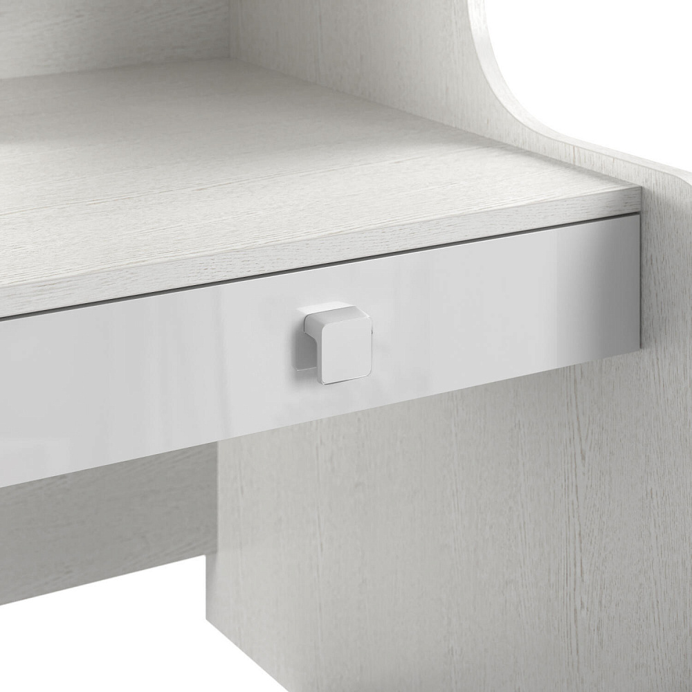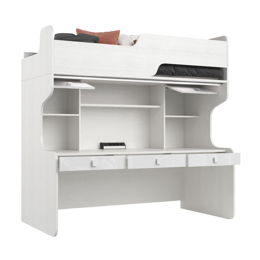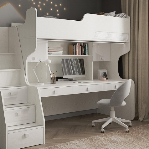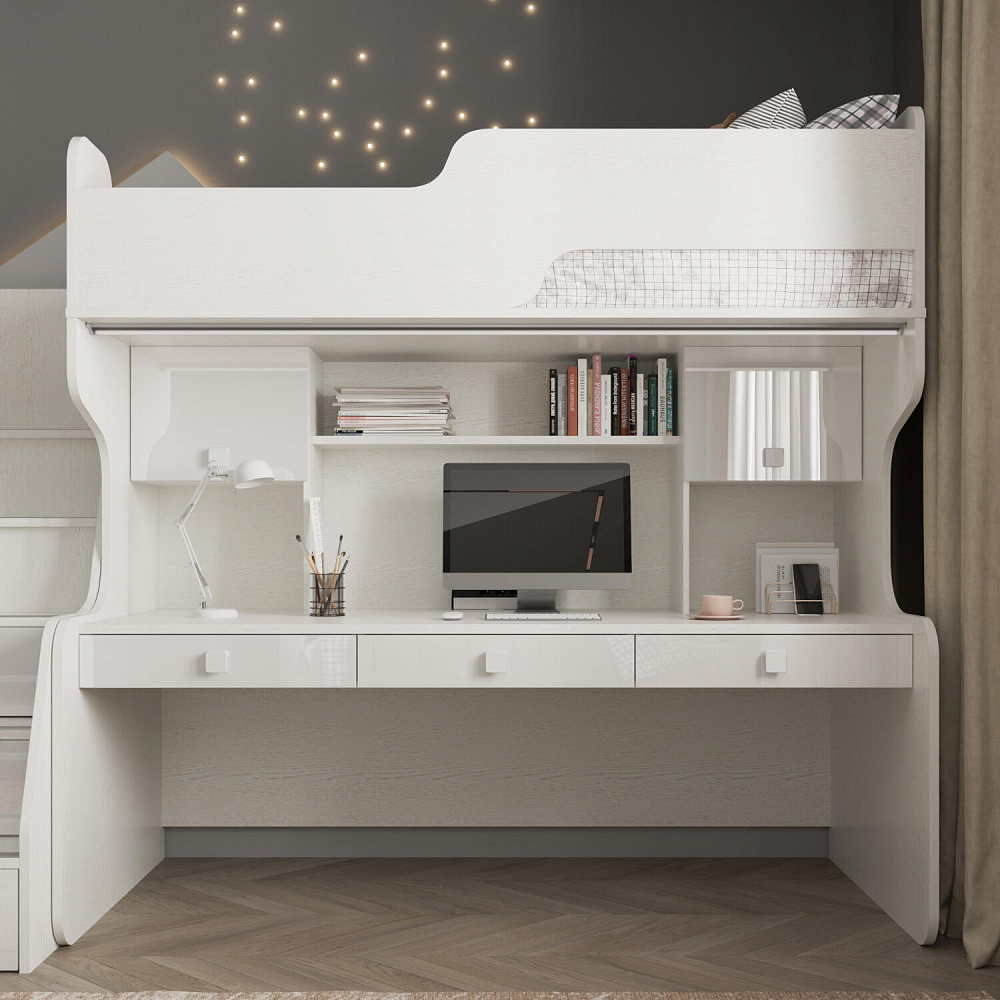 Продуманная двухместная рабочая зона с системой хранения. Под кроватью есть просторная столешница с отверстием для проводов, три выдвижных ящика, два шкафа и открытые полки. Рабочее место будет удобно как для одного, так и для двоих детей, места хватит всем учебным материалам и канцелярии.