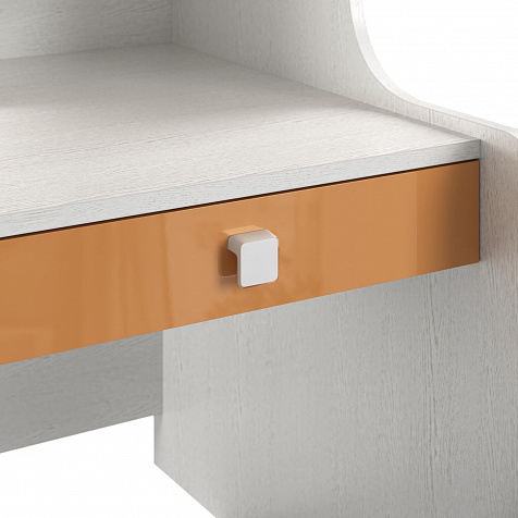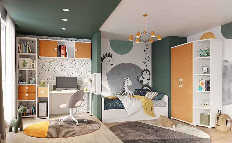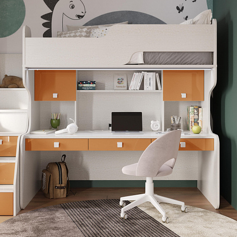 Продуманная двухместная рабочая зона с системой хранения. Под кроватью есть просторная столешница с отверстием для проводов, три выдвижных ящика, два шкафа и открытые полки. Рабочее место будет удобно как для одного, так и для двоих детей, места хватит всем учебным материалам и канцелярии.