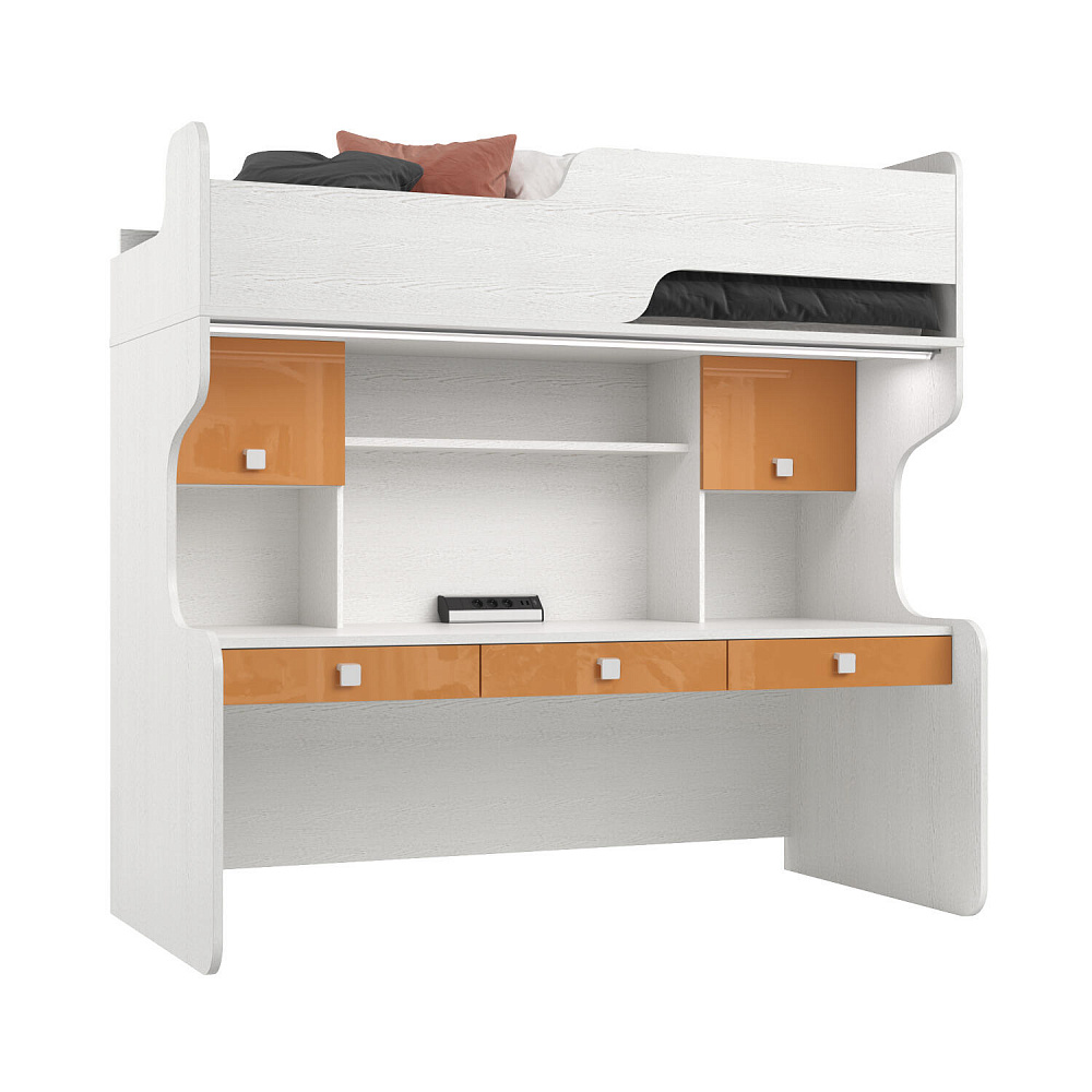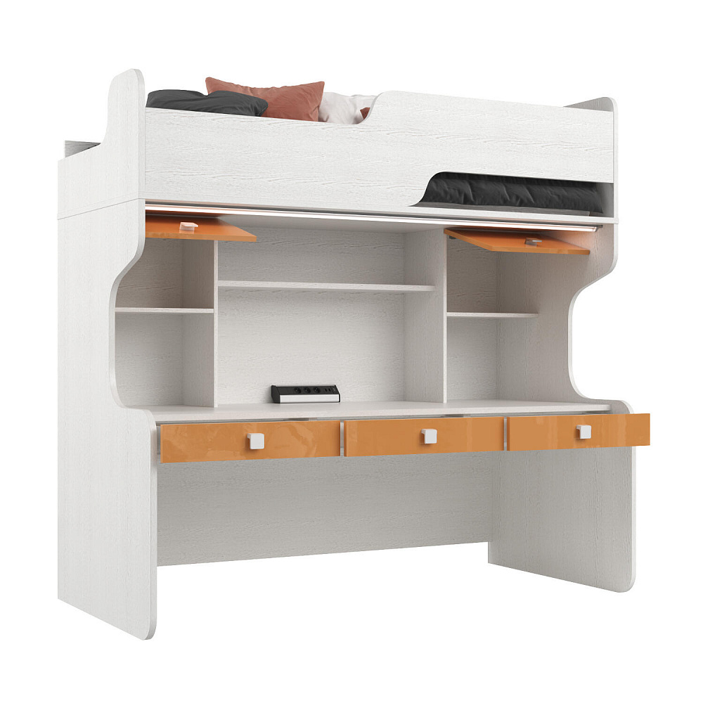 Диодный светильник и блок розеток. В комплект модуля входит диодный светильник с сенсорными выключателем, который крепится к дну спального места и даёт мягкий свет над рабочим столом. Для подключения светильника в комплекте к кровати предусмотрен блок розеток с USB-разъёмами.