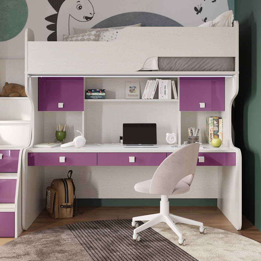Продуманная двухместная рабочая зона с системой хранения. Под кроватью есть просторная столешница с отверстием для проводов, три выдвижных ящика, два шкафа и открытые полки. Рабочее место будет удобно как для одного, так и для двоих детей, места хватит всем учебным материалам и канцелярии.