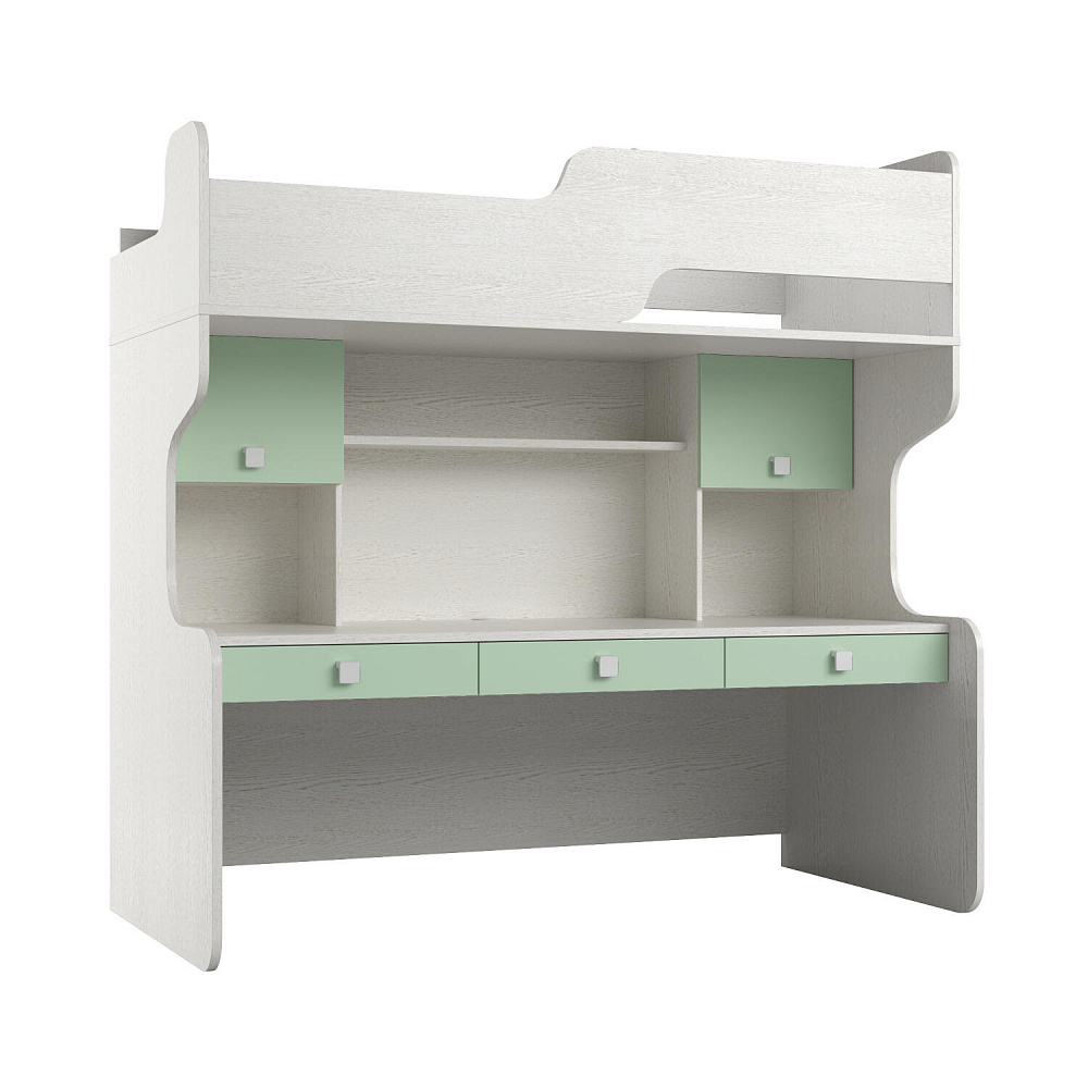 Продуманная двухместная рабочая зона с системой хранения. Под кроватью есть просторная столешница с отверстием для проводов, три выдвижных ящика, два шкафа и открытые полки. Рабочее место будет удобно как для одного, так и для двоих детей, места хватит всем учебным материалам и аксессуарам.