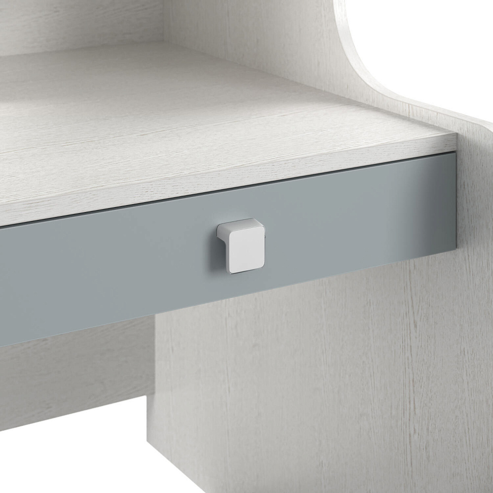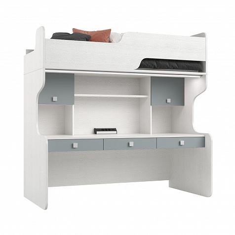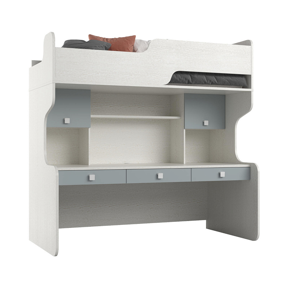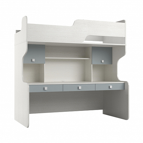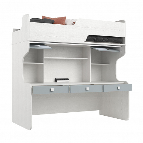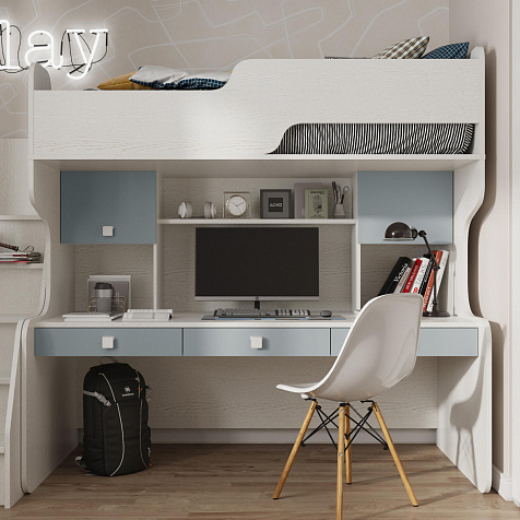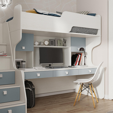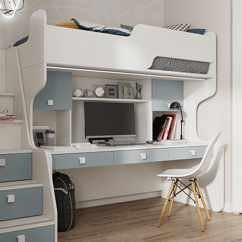 Продуманная двухместная рабочая зона с системой хранения. Под кроватью есть просторная столешница с отверстием для проводов, три выдвижных ящика, два шкафа и открытые полки. Рабочее место будет удобно как для одного, так и для двоих детей, места хватит всем учебным материалам и аксессуарам.