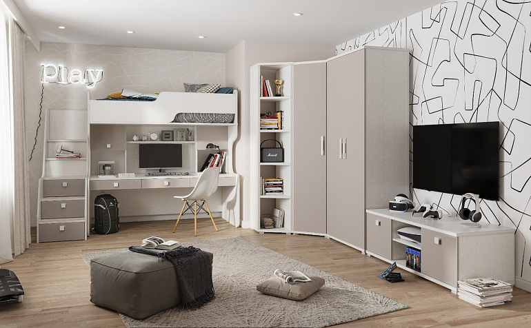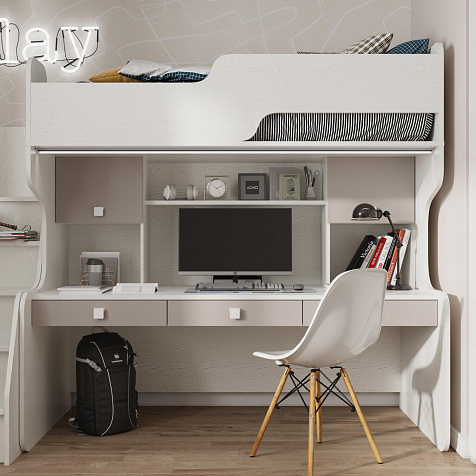 Продуманная двухместная рабочая зона с системой хранения. Под кроватью есть просторная столешница с отверстием для проводов, три выдвижных ящика, два шкафа и открытые полки. Рабочее место будет удобно как для одного, так и для двоих детей, места хватит всем учебным материалам и аксессуарам.