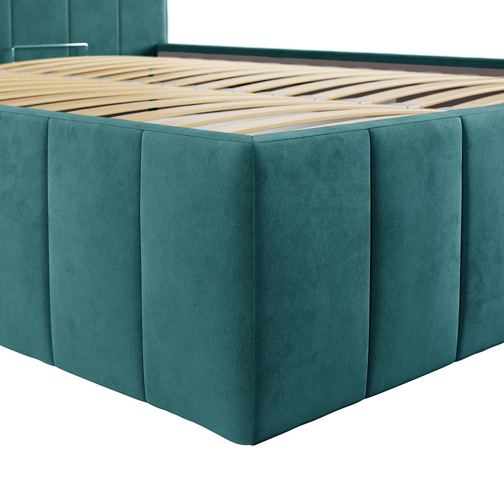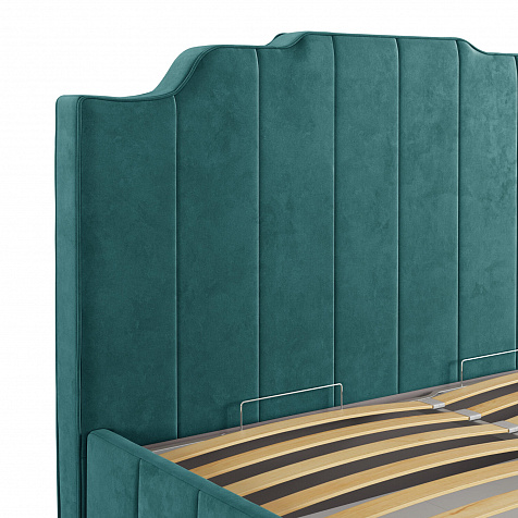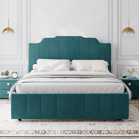 Мягкая кровать «Мадлен» в обивке из велюра дополнит интерьер спальни в современном стиле. Дизайн модели отличается высоким фигурным изголовьем с вертикальными строчками. Ортопедическое основание с удобным механизмом подъёма и вместительный бельевой короб порадуют своего обладателя.