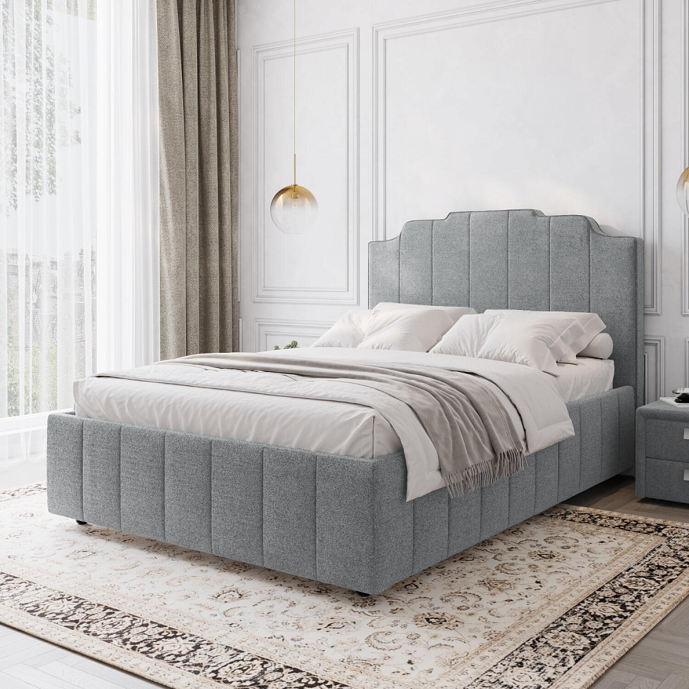 Мягкая кровать «Мадлен» в обивке из велюра дополнит интерьер спальни в современном стиле. Дизайн модели отличается высоким фигурным изголовьем с вертикальными строчками. Ортопедическое основание с удобным механизмом подъёма и вместительный бельевой короб порадуют своего обладателя.