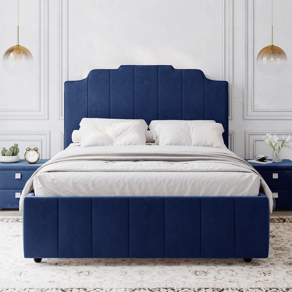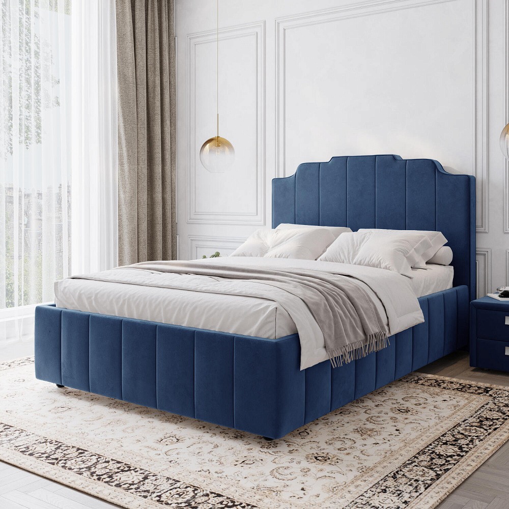 Мягкая кровать «Мадлен» в обивке из велюра дополнит интерьер спальни в современном стиле. Дизайн модели отличается высоким фигурным изголовьем с вертикальными строчками. Ортопедическое основание с удобным механизмом подъёма и вместительный бельевой короб порадуют своего обладателя.