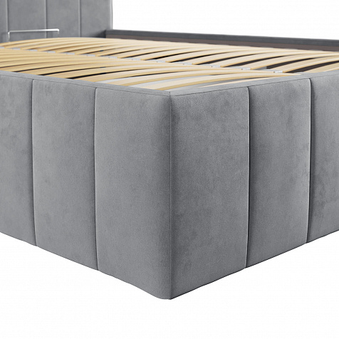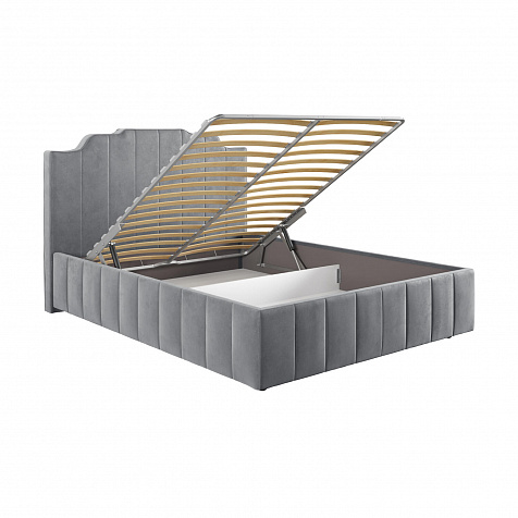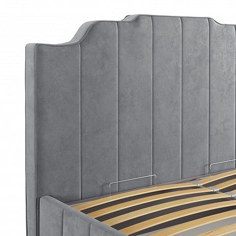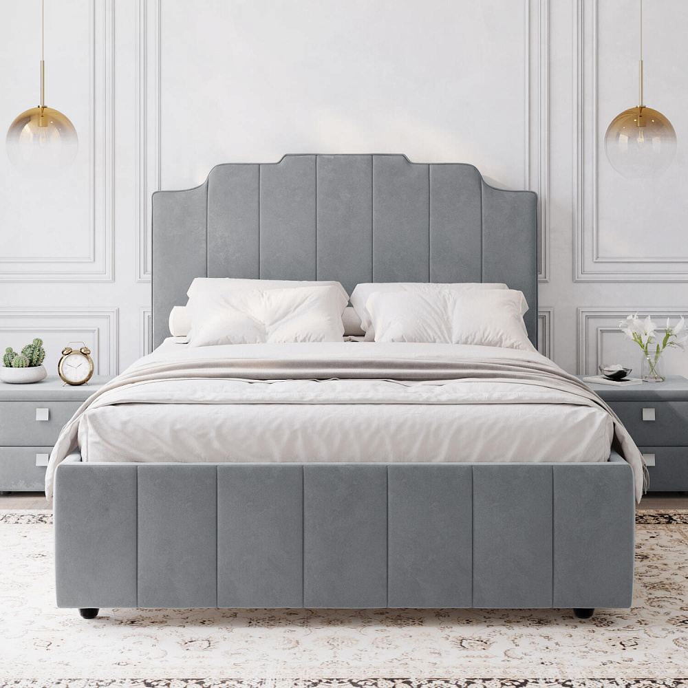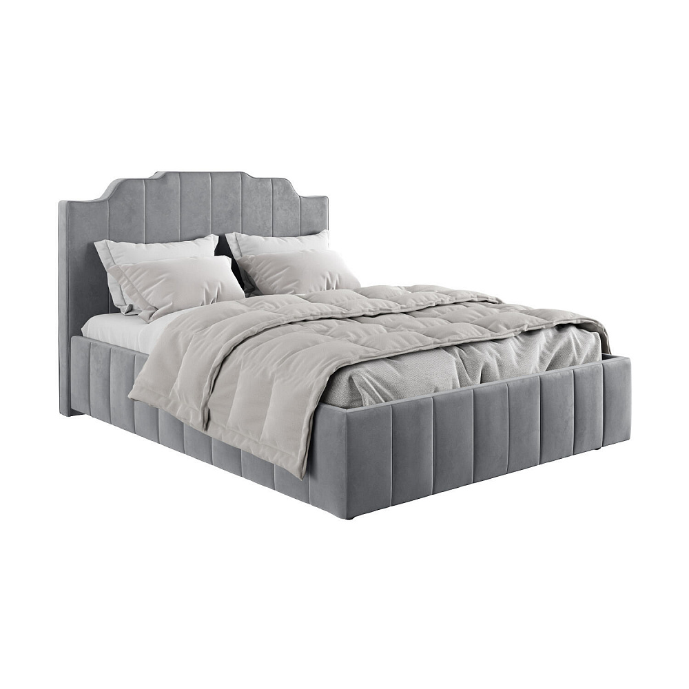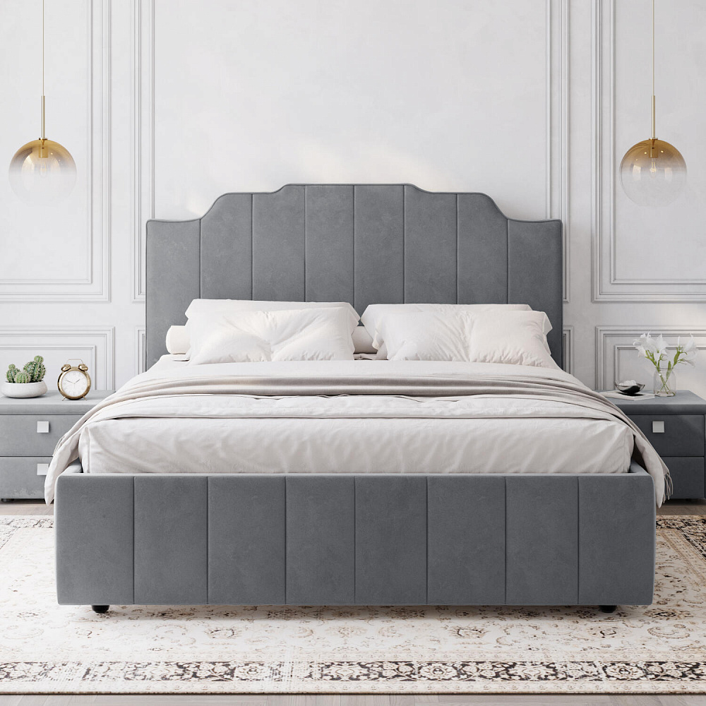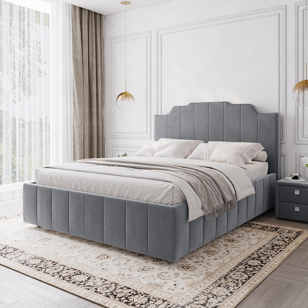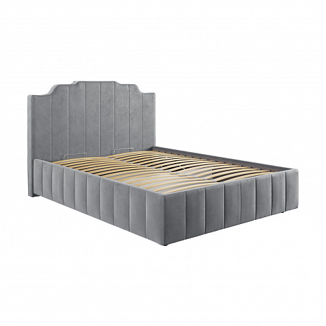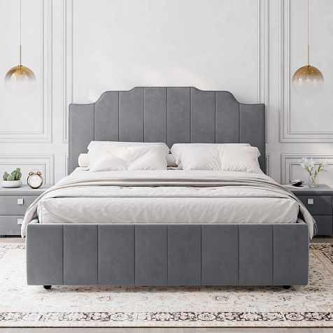 Мягкая кровать «Мадлен» в обивке из велюра дополнит интерьер спальни в современном стиле. Дизайн модели отличается высоким фигурным изголовьем с вертикальными строчками. Ортопедическое основание с удобным механизмом подъёма и вместительный бельевой короб порадуют своего обладателя.