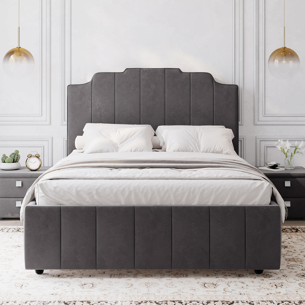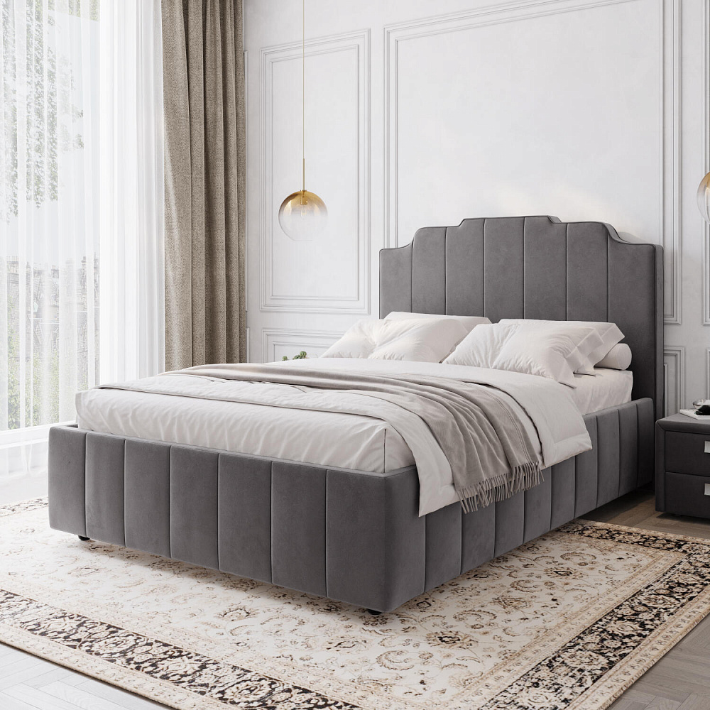 Мягкая кровать «Мадлен» в обивке из велюра дополнит интерьер спальни в современном стиле. Дизайн модели отличается высоким фигурным изголовьем с вертикальными строчками. Ортопедическое основание с удобным механизмом подъёма и вместительный бельевой короб порадуют своего обладателя.