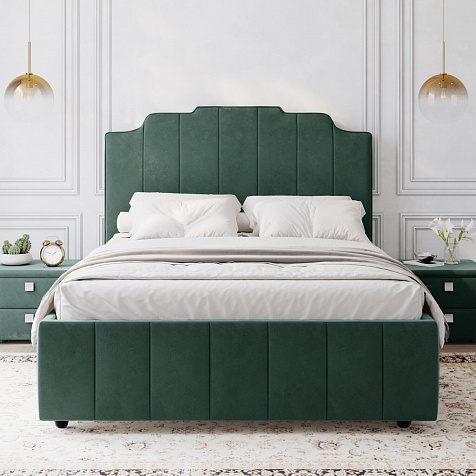 Мягкая кровать «Мадлен» в обивке из велюра дополнит интерьер спальни в современном стиле. Дизайн модели отличается высоким фигурным изголовьем с вертикальными строчками. Ортопедическое основание с удобным механизмом подъёма и вместительный бельевой короб порадуют своего обладателя.