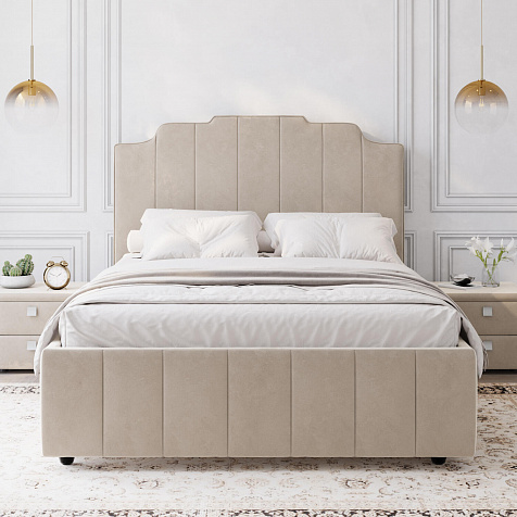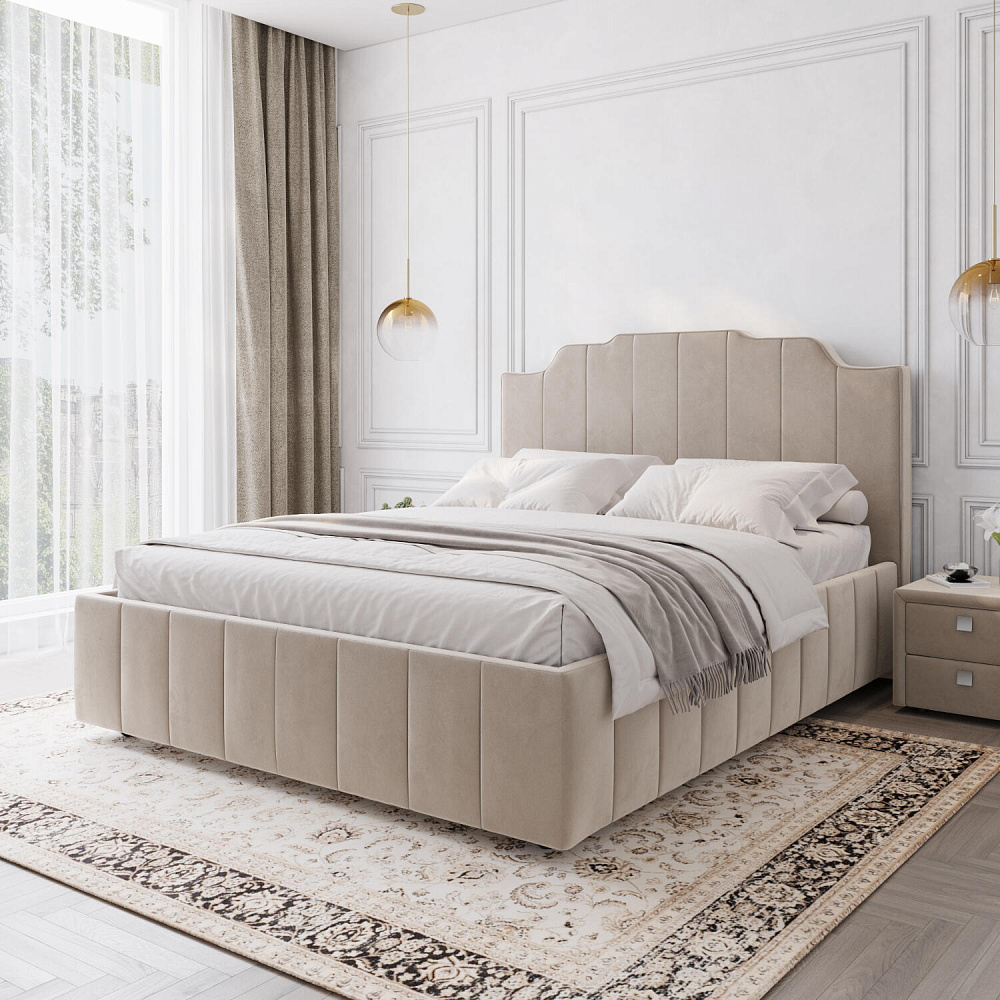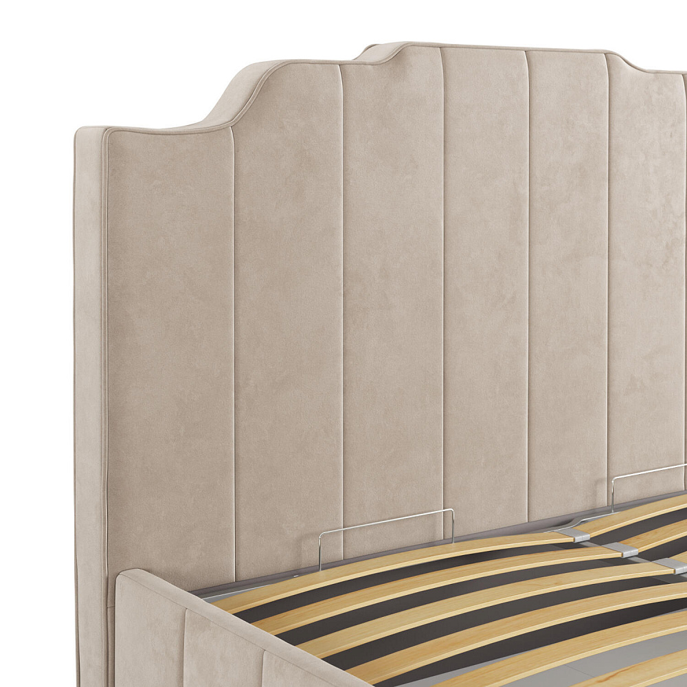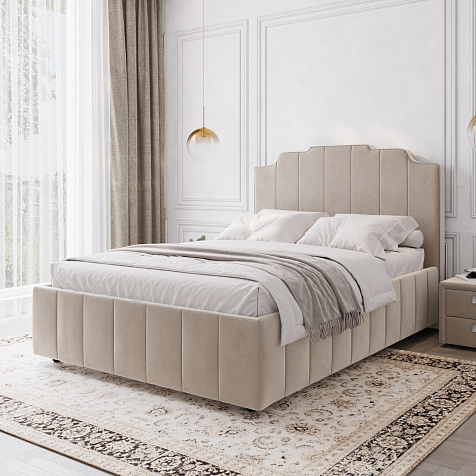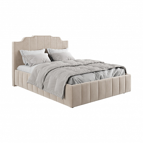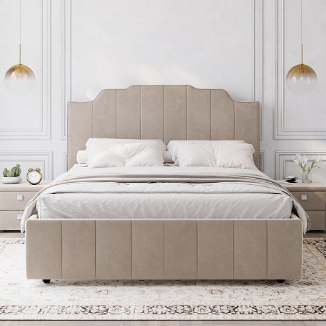 Мягкая кровать «Мадлен» в обивке из велюра дополнит интерьер спальни в современном стиле. Дизайн модели отличается высоким фигурным изголовьем с вертикальными строчками. Ортопедическое основание с удобным механизмом подъёма и вместительный бельевой короб порадуют своего обладателя.