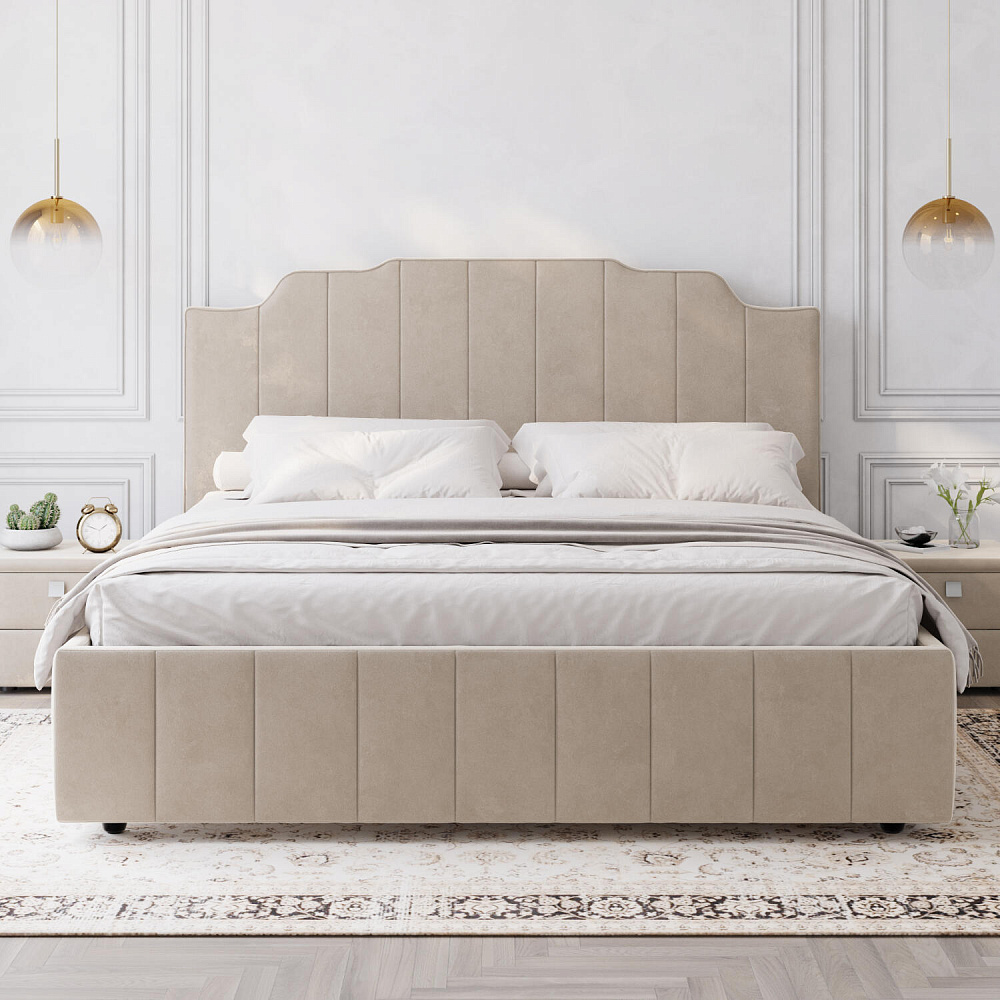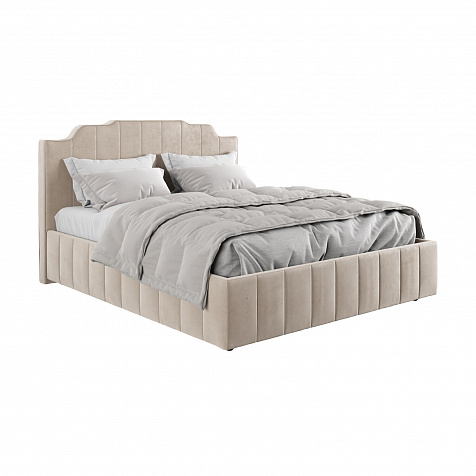 Мягкая кровать «Мадлен» в обивке из велюра дополнит интерьер спальни в современном стиле. Дизайн модели отличается высоким фигурным изголовьем с вертикальными строчками. Ортопедическое основание с удобным механизмом подъёма и вместительный бельевой короб порадуют своего обладателя.