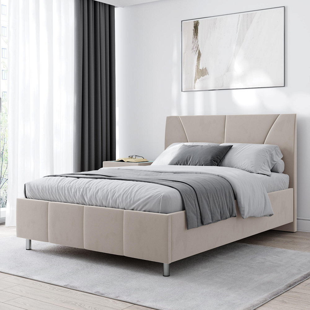 Мягкая кровать «Каролина» для тех, кому важен здоровый сон и эстетичный вид мебели. Дизайн отличается диагональными и прямыми строчками и слегка изогнутым изголовьем. Возвышение на ножках добавит в интерьер динамики и лёгкости. Кровать также поможет сэкономить пространство квартиры благодаря вместительному бельевому коробу под решёткой.