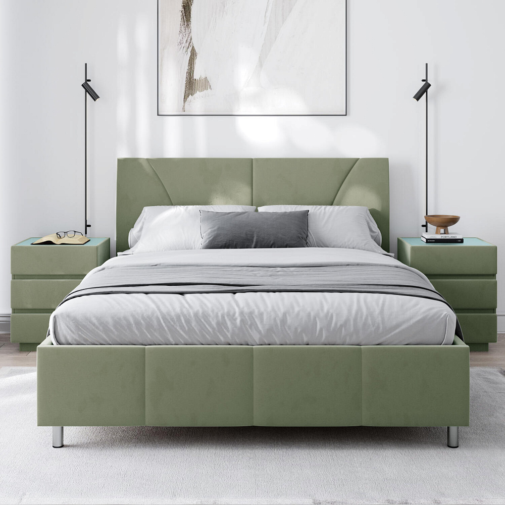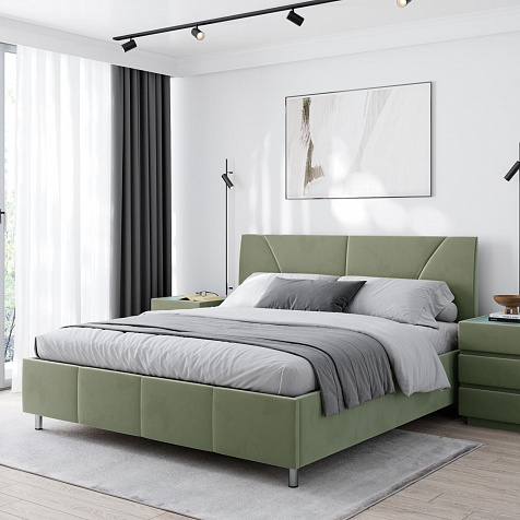 Мягкая кровать «Каролина» для тех, кому важен здоровый сон и эстетичный вид мебели. Дизайн отличается диагональными и прямыми строчками и слегка изогнутым изголовьем. Возвышение на ножках добавит в интерьер динамики и лёгкости. Кровать также поможет сэкономить пространство квартиры благодаря вместительному бельевому коробу под решёткой.